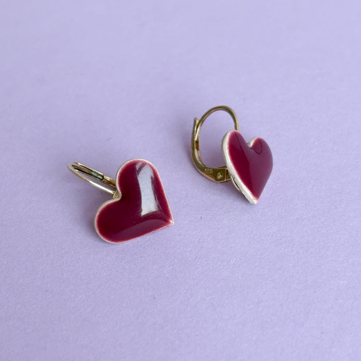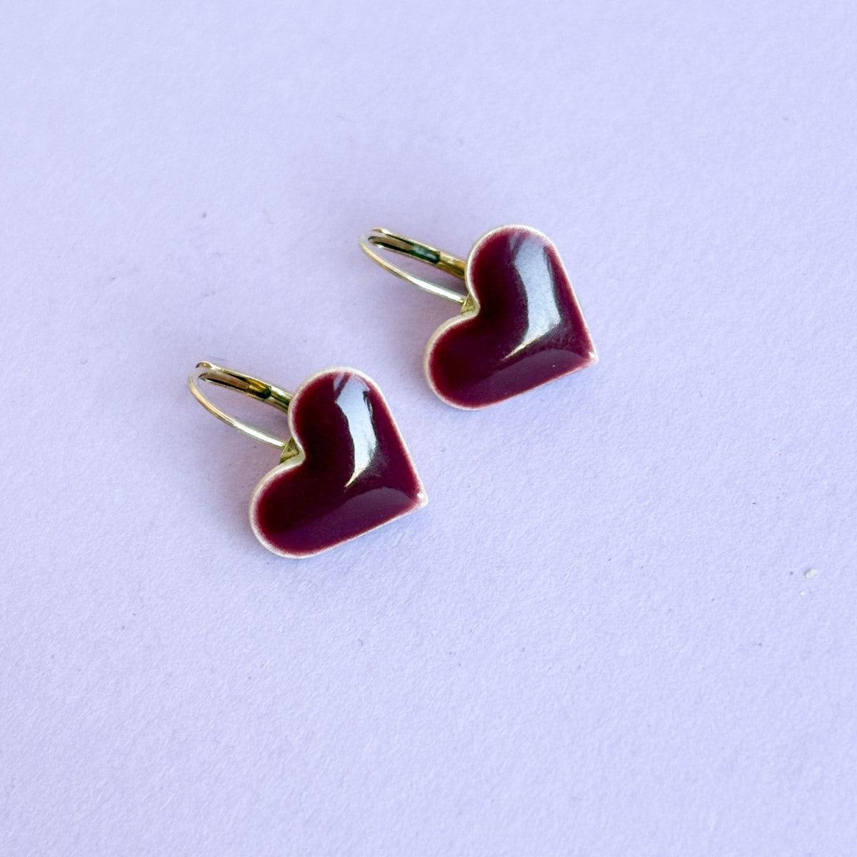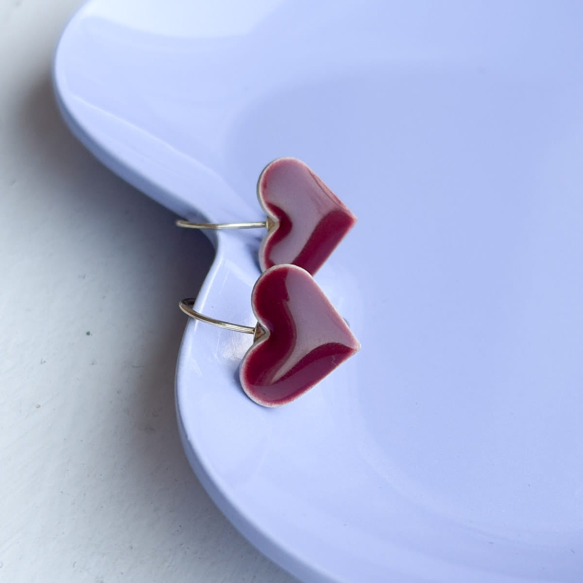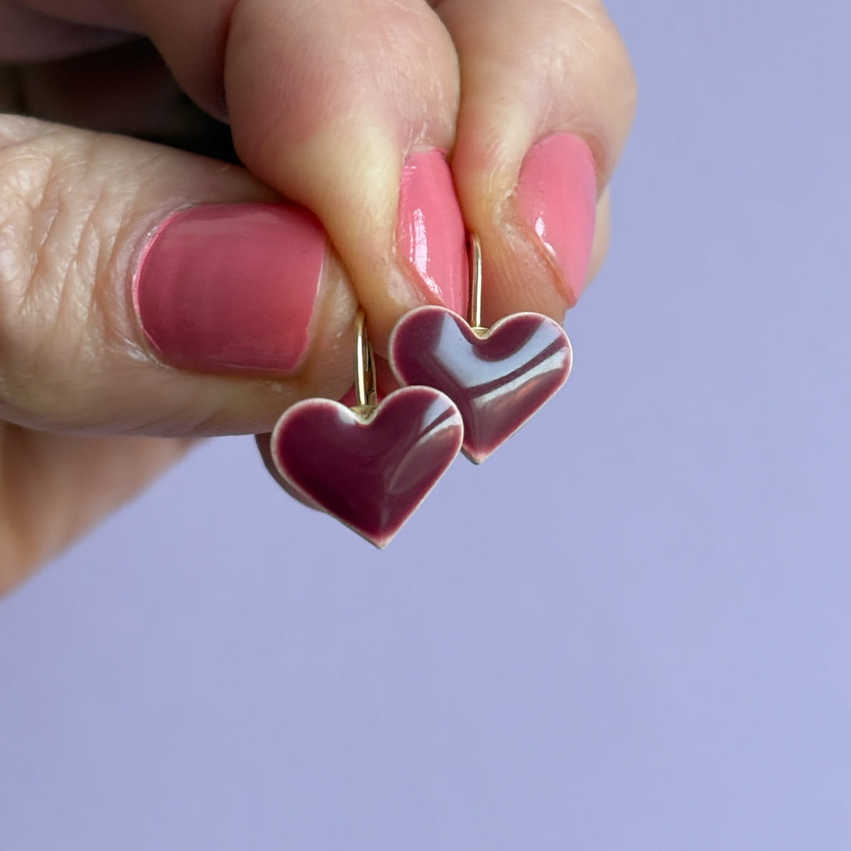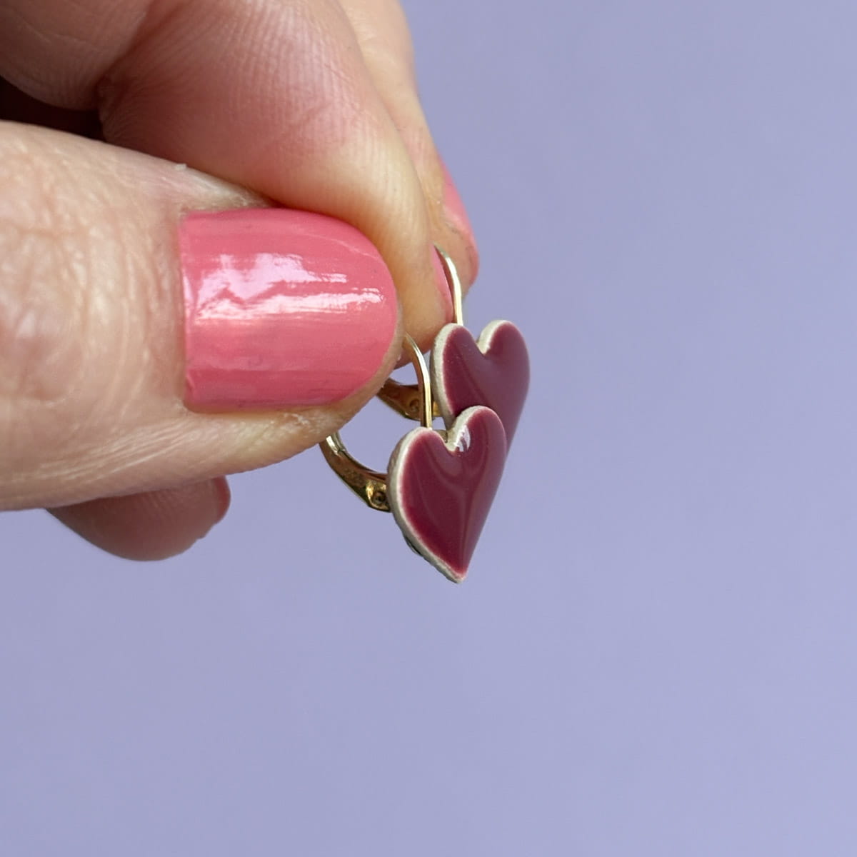 Diese Keramik-Herzohrringe leuchten in einem warmen Beerenton. Jedes Paar wird von mir von Hand gefertigt, glasiert und zweimal gebrannt – so wird jedes Stück zu einem echten Unikat.