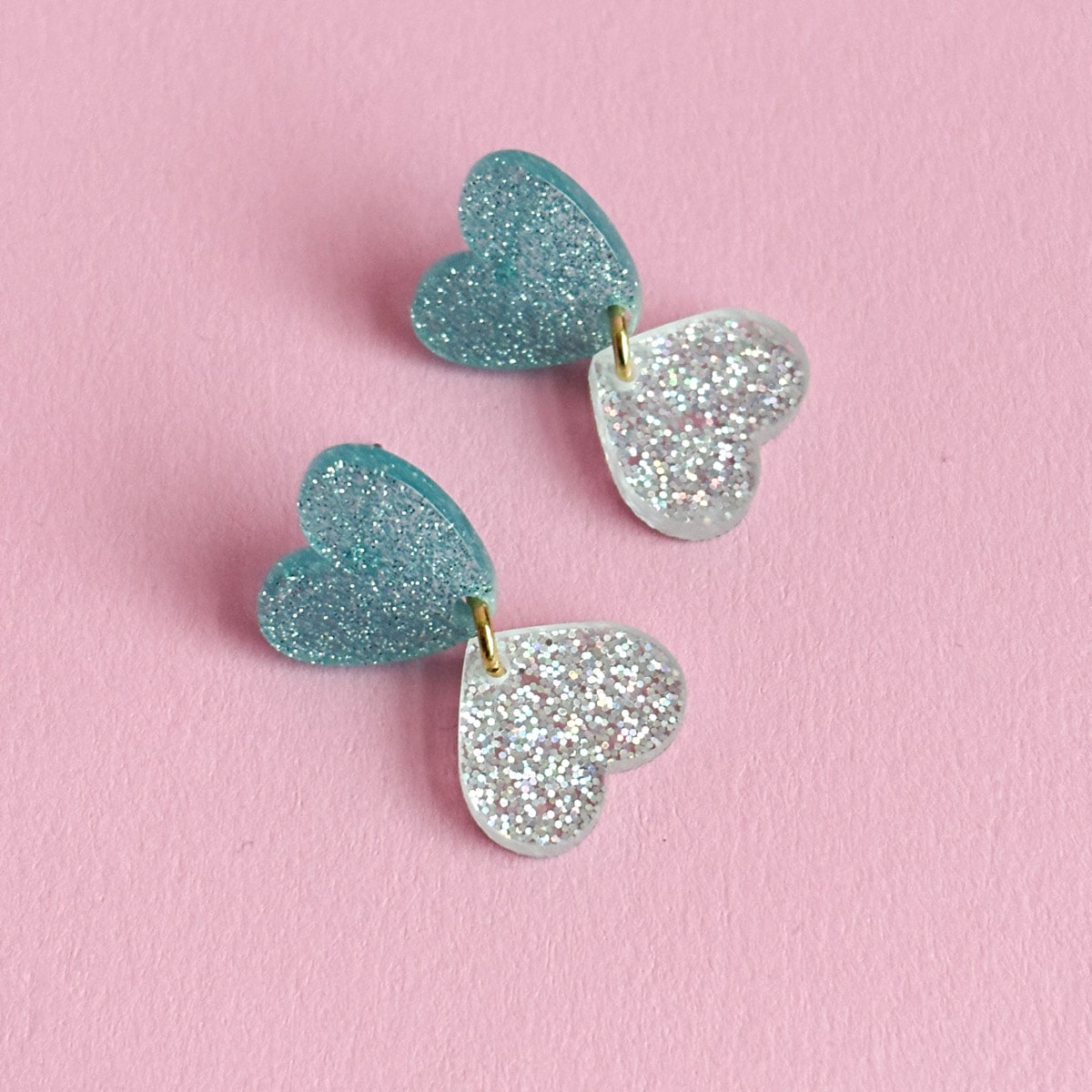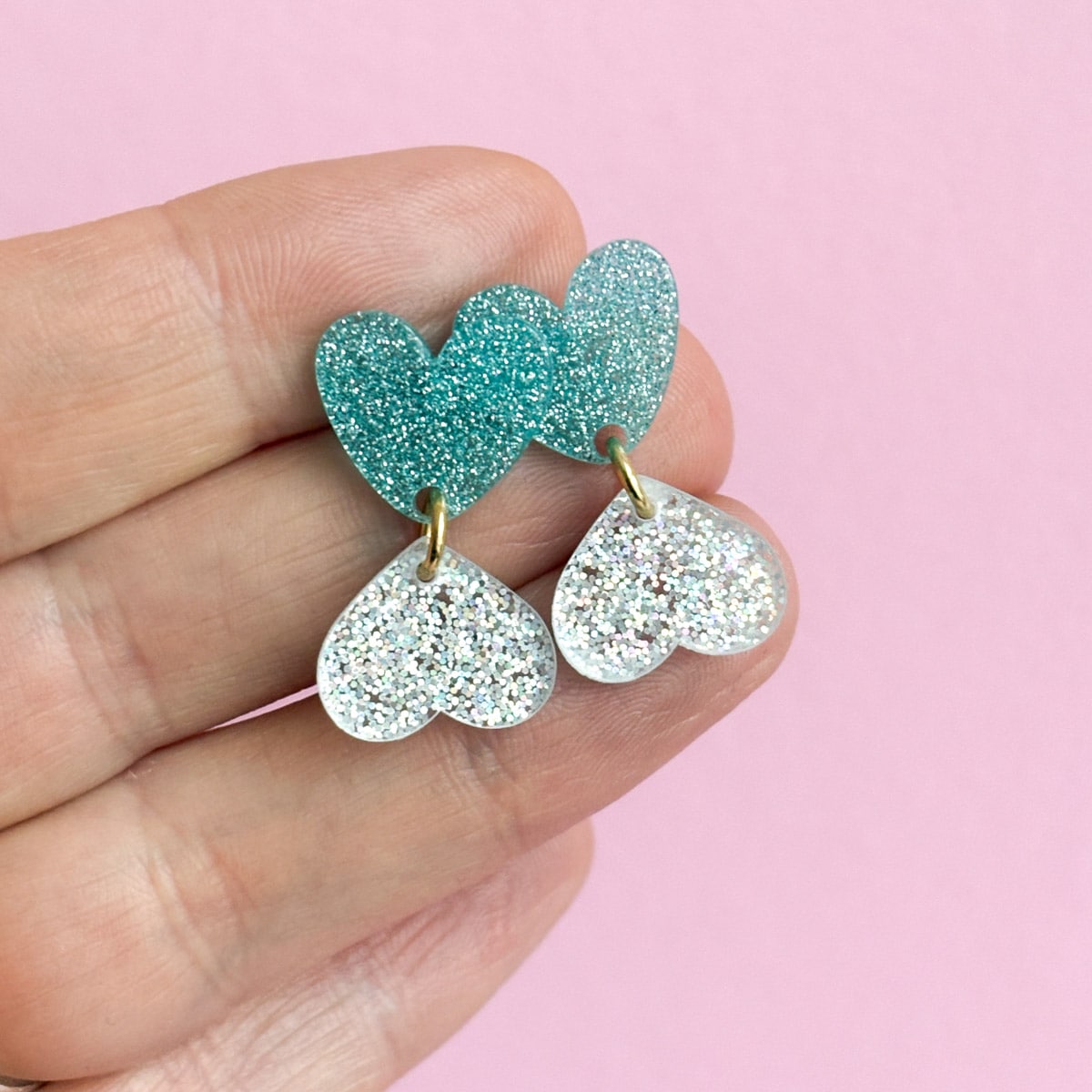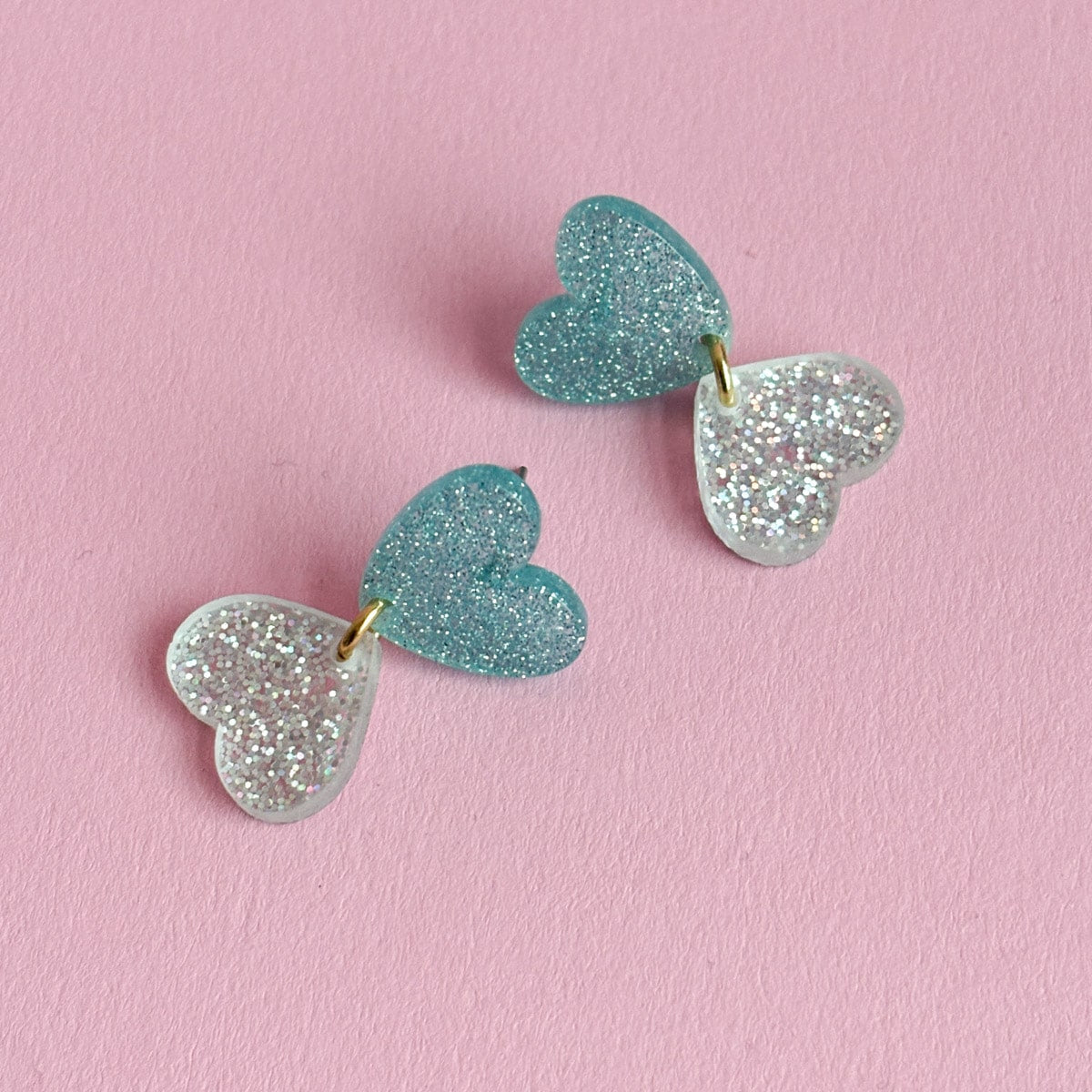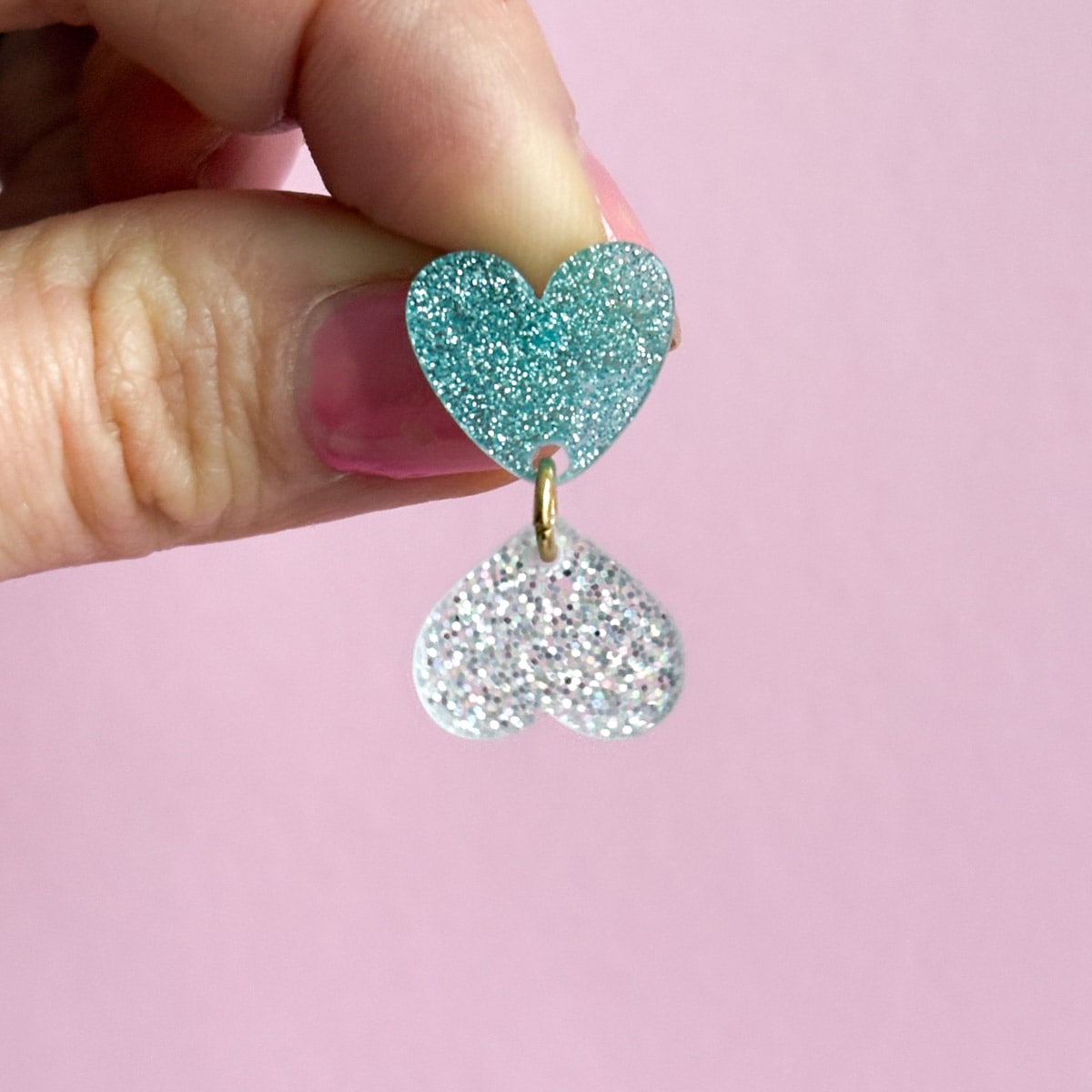 • Design: Zweiteilige Herz-Ohrringe in türkis & bunt leuchtendem Silberglitzer
