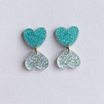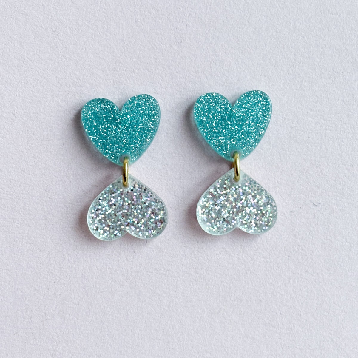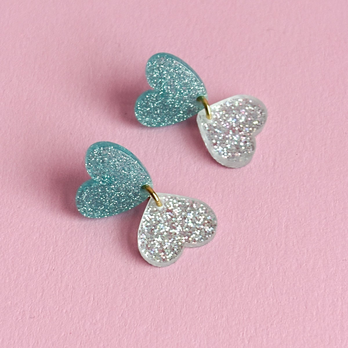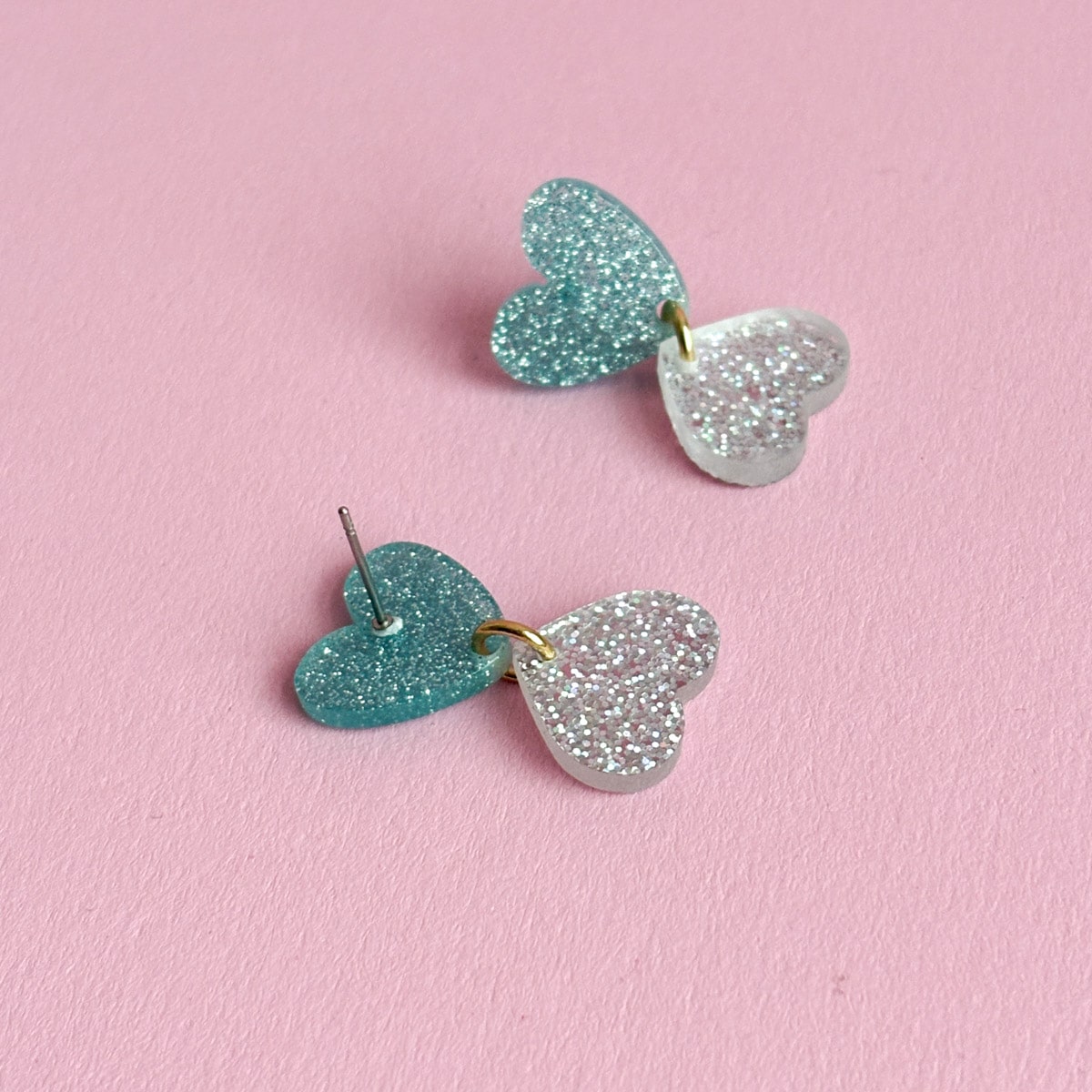 • Design: Zweiteilige Herz-Ohrringe in türkis & bunt leuchtendem Silberglitzer