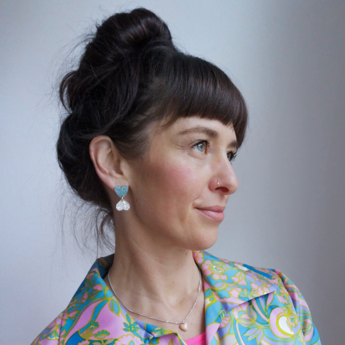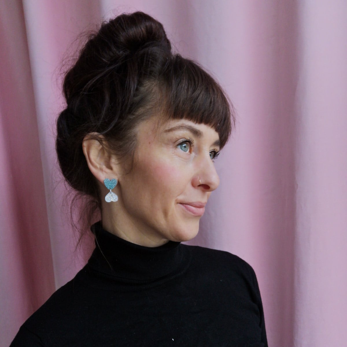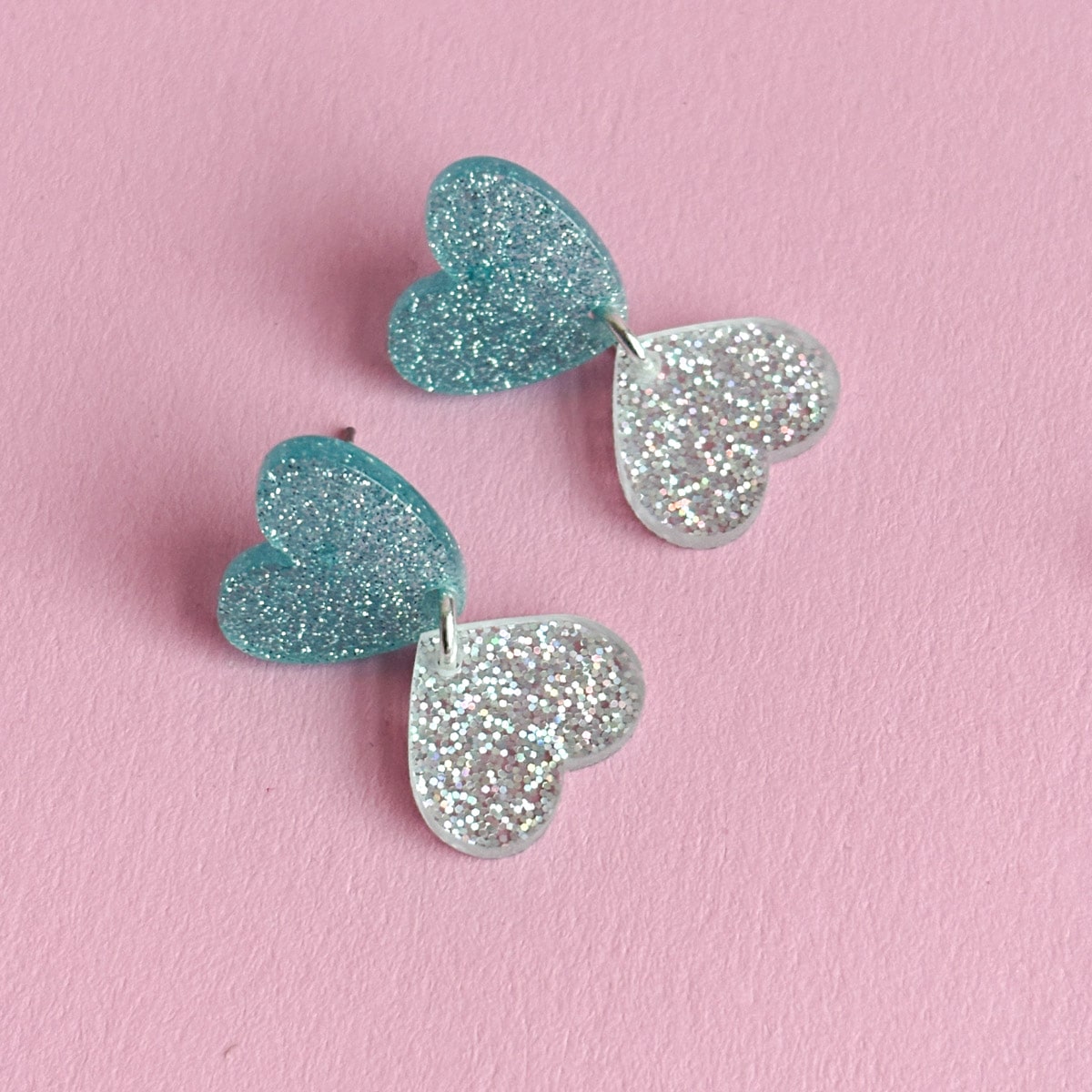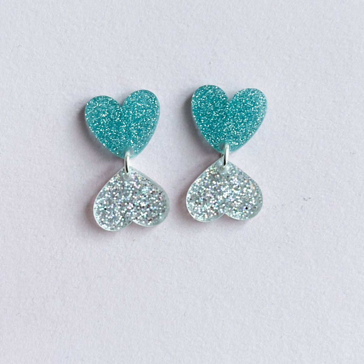 • Design: Zweiteilige Herz-Ohrringe in türkis & bunt leuchtendem Silberglitzer