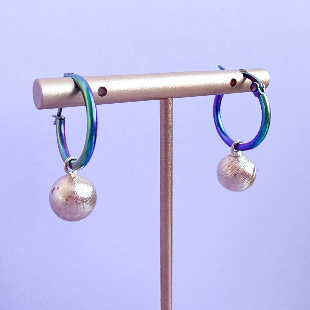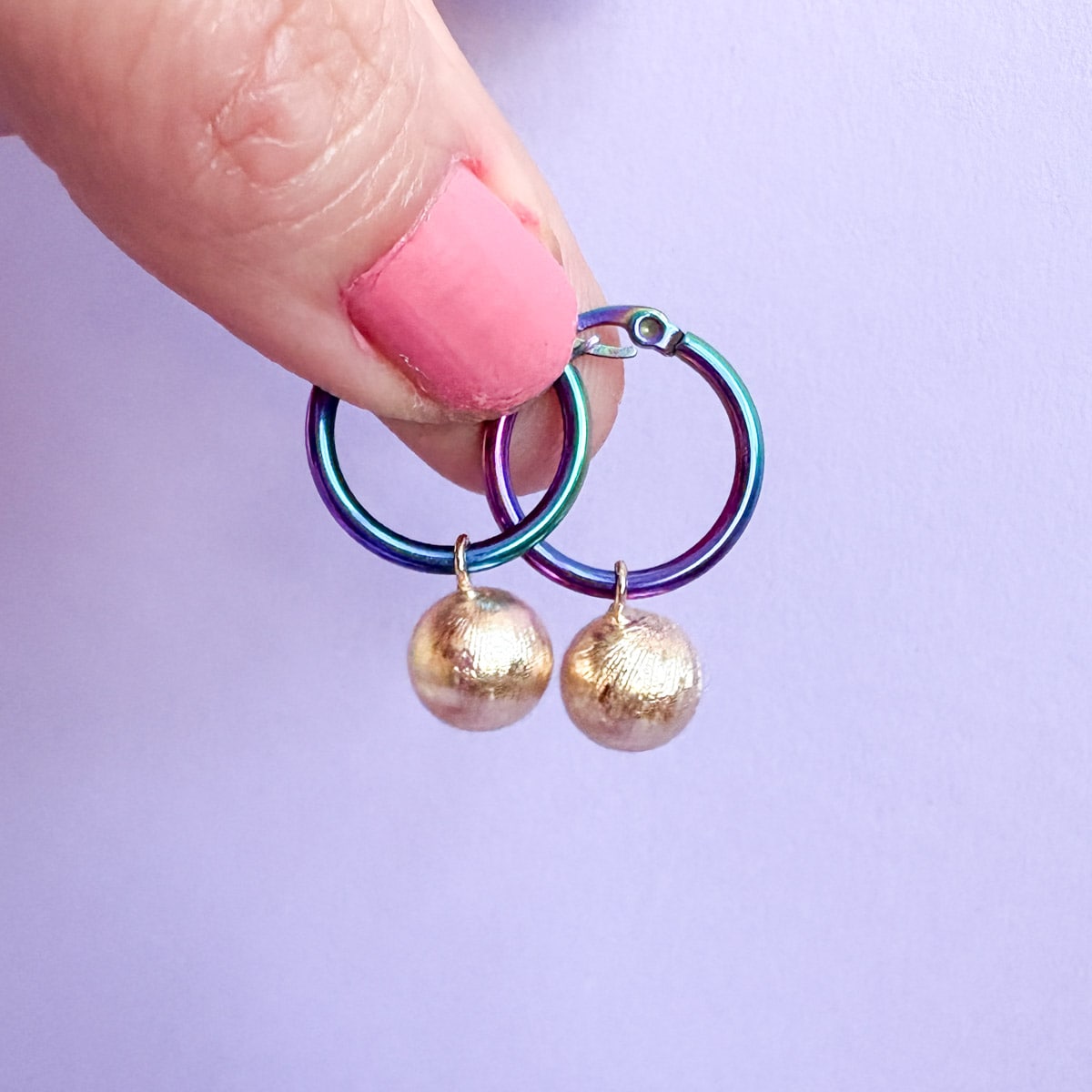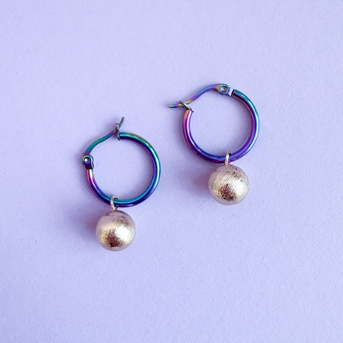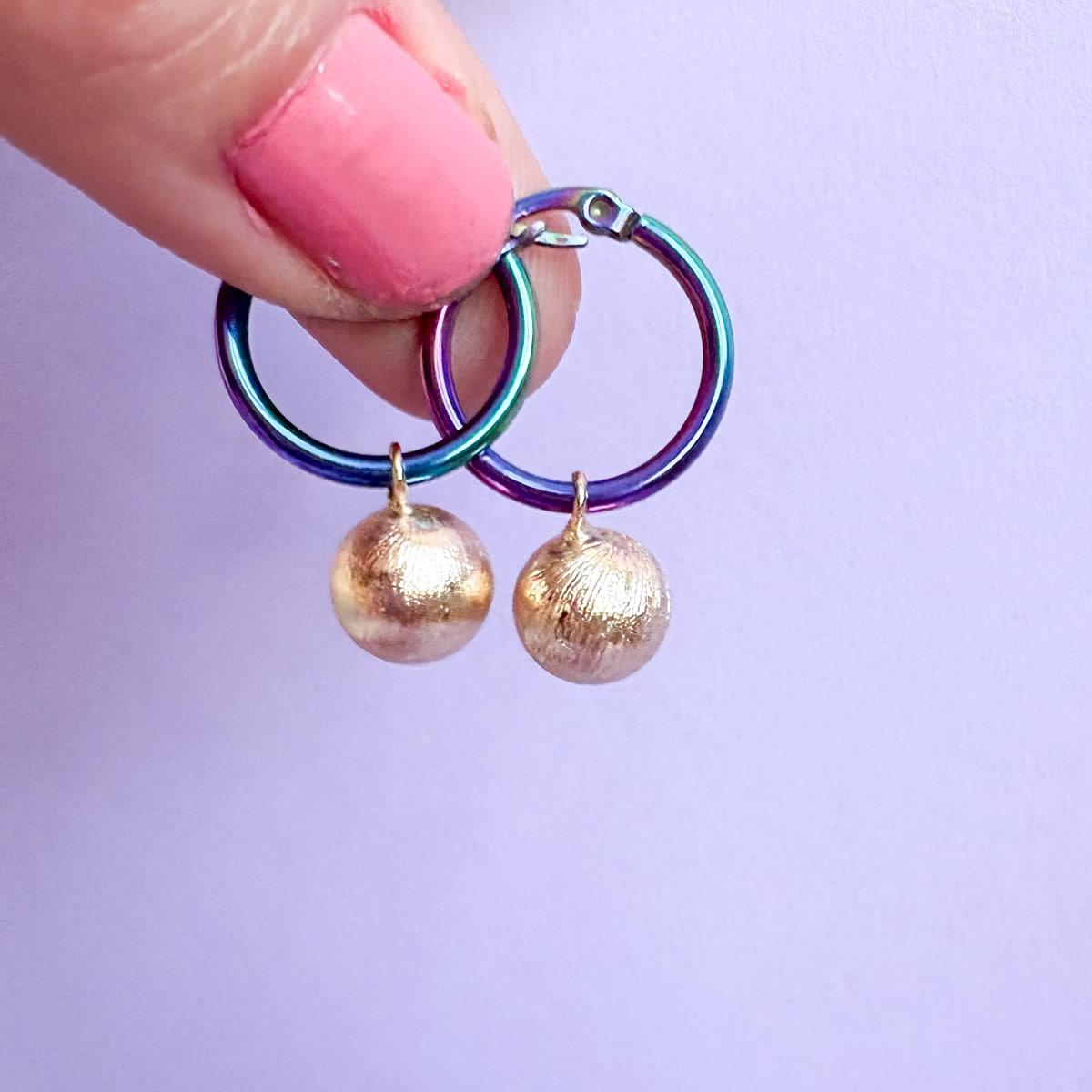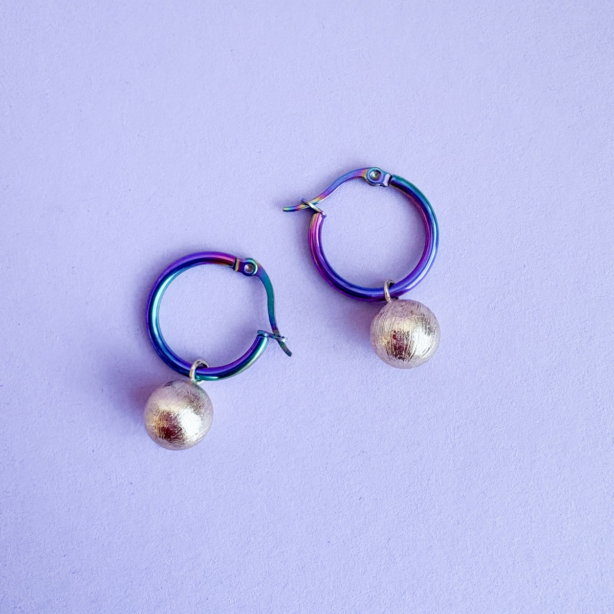 Ein Hauch Magie für dein Schmuckkästchen: Diese farbigen Creolen vereinen lebendige Nuancen in Blau, Violett und Grün mit einer glänzend vergoldeten Kugel, die das Licht auf wunderschöne Weise einfängt. Modern, verspielt und gleichzeitig edel – ein Eyecatcher für jeden Anlass.