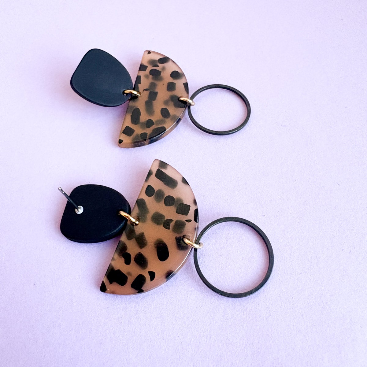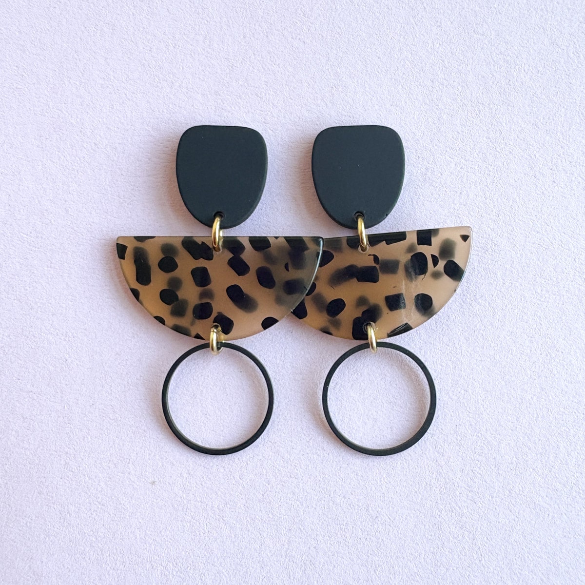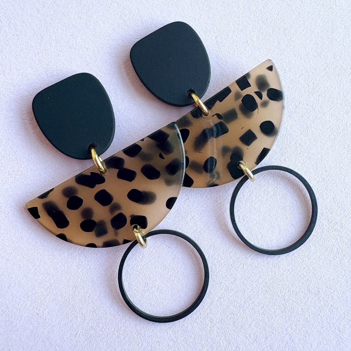 Auffällig, modern und einzigartig – diese dreiteiligen Statement-Ohrringe spielen mit klaren Formen und markanten Farben. Schwarzer Stecker, halbrunder Anhänger im Leo-Muster und ein schlichter Ring verbinden sich zu einem spannenden Design, das Wildheit und Eleganz perfekt vereint.