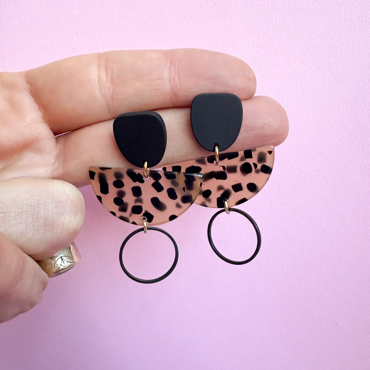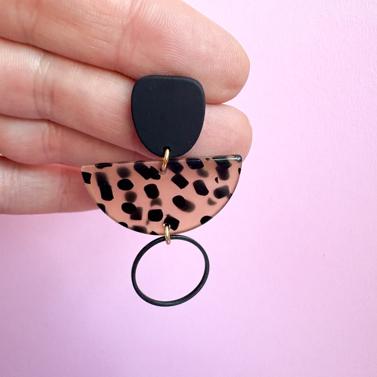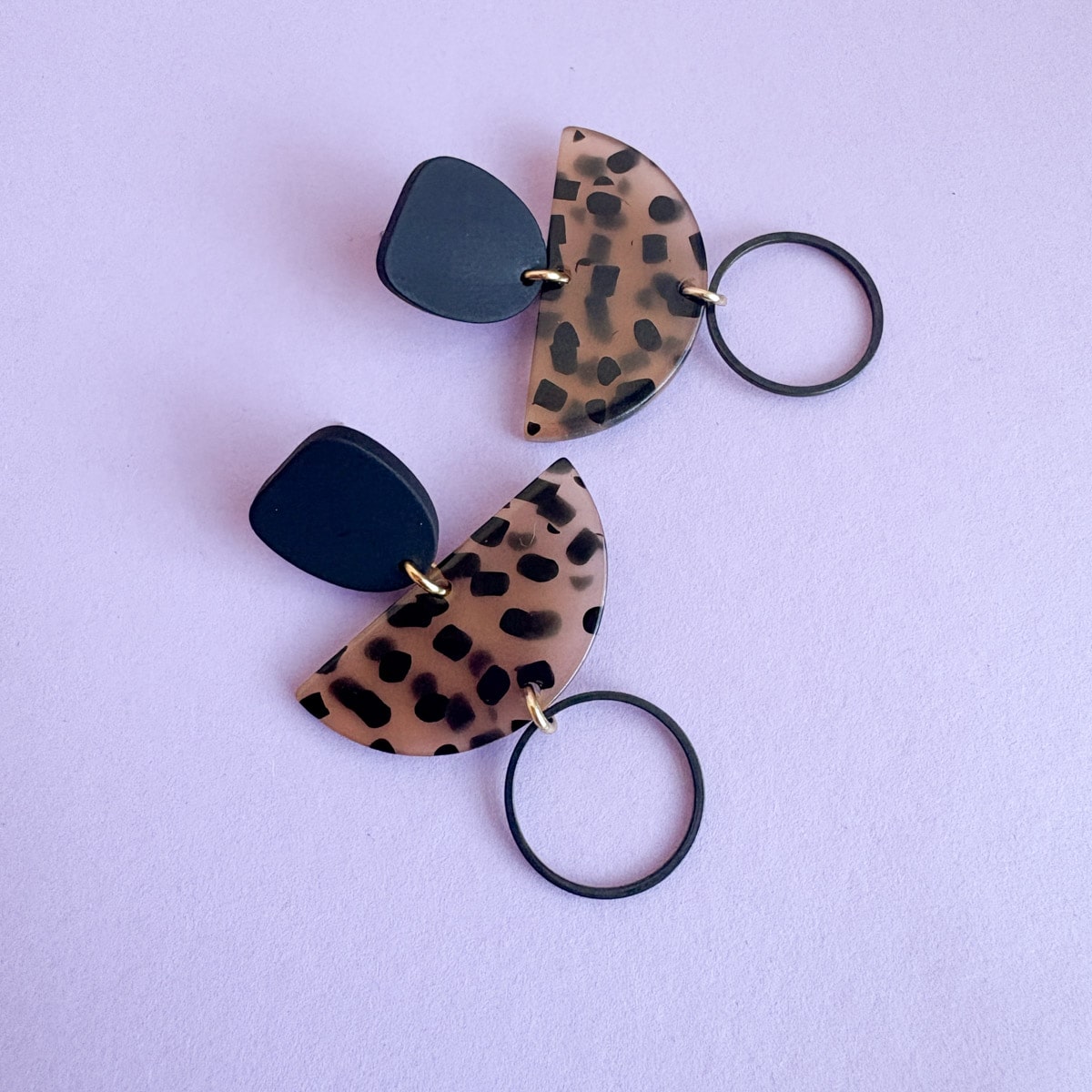 Auffällig, modern und einzigartig – diese dreiteiligen Statement-Ohrringe spielen mit klaren Formen und markanten Farben. Schwarzer Stecker, halbrunder Anhänger im Leo-Muster und ein schlichter Ring verbinden sich zu einem spannenden Design, das Wildheit und Eleganz perfekt vereint.