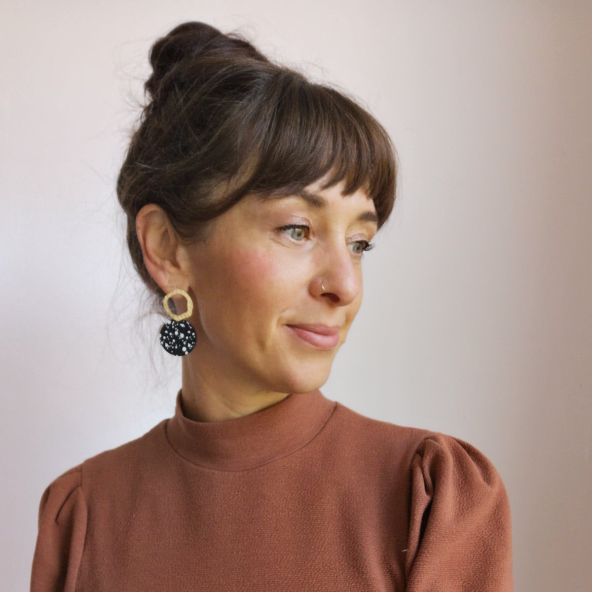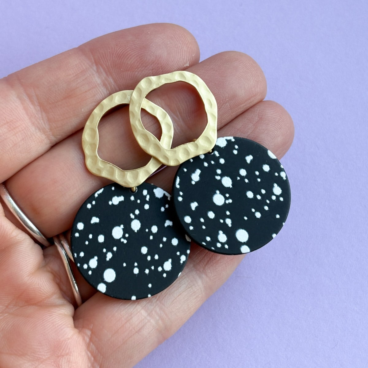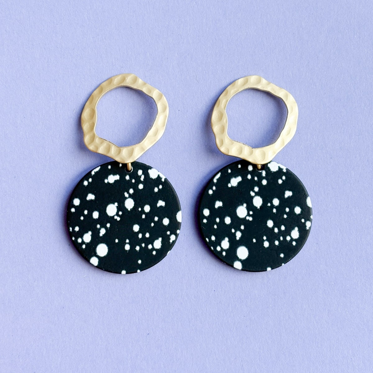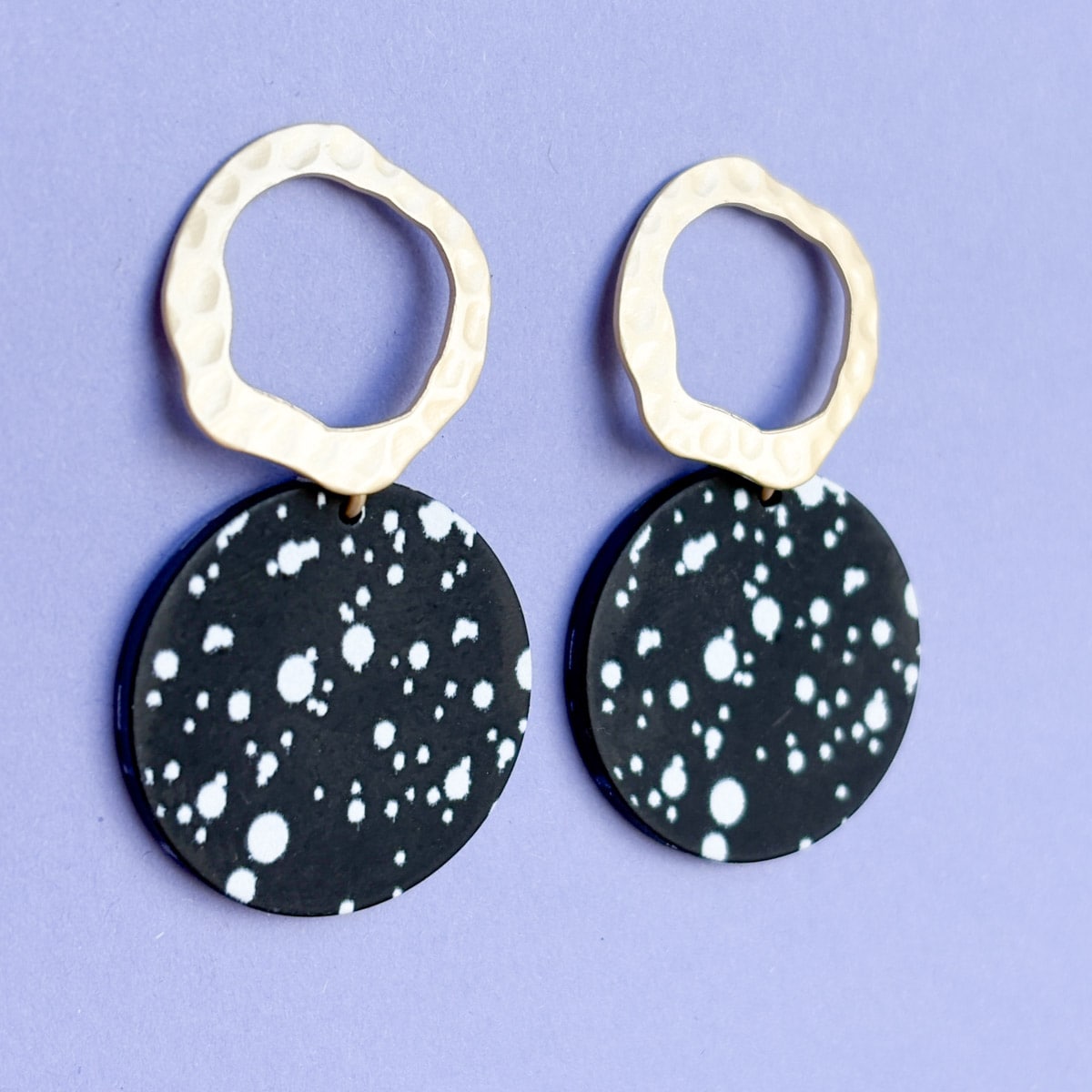 Schlicht, modern und stilvoll – diese geometrischen Ohrringe kombinieren einen matt vergoldeten, gehämmerten Ring mit einem runden Anhänger in Schwarz-Weiß-Sprenkeloptik. Ein Design, das auffällt, ohne aufdringlich zu sein.