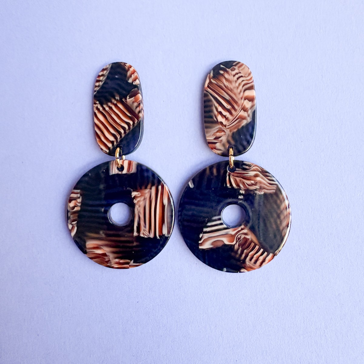 Perfekt für Herbst/Winter: Diese großen Statement-Ohrringe verbinden ein modernes Design mit einem spannenden Muster in Dunkelblau und Beige. Der Mix aus ovalem Stecker und rundem Anhänger mit Cut-out macht sie zum Eyecatcher, der deinen Outfits Wärme, Stil und Ausdruck verleiht.