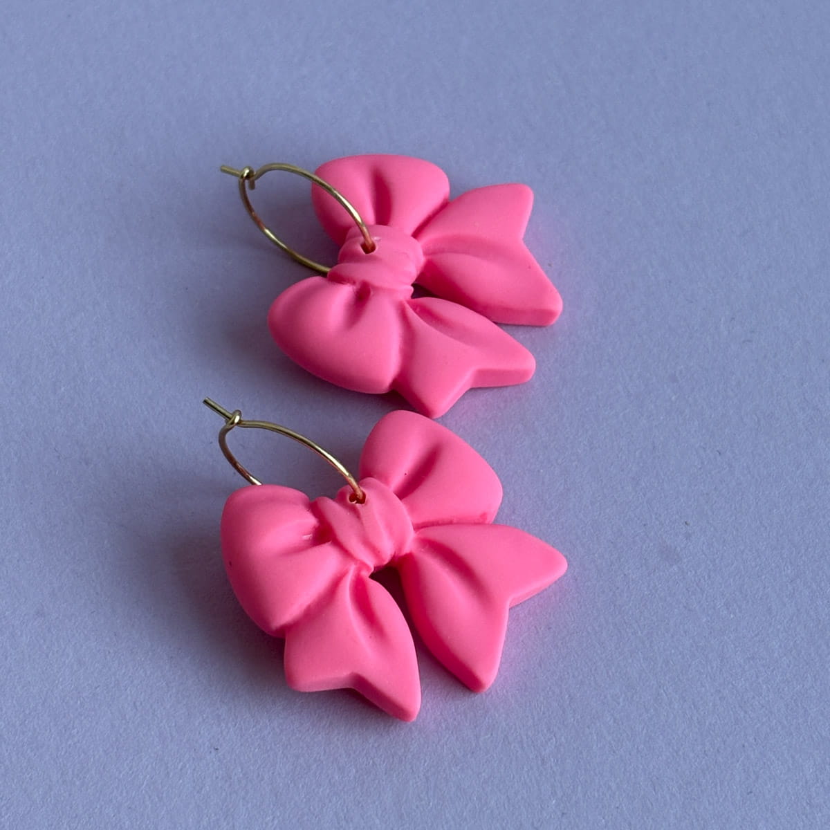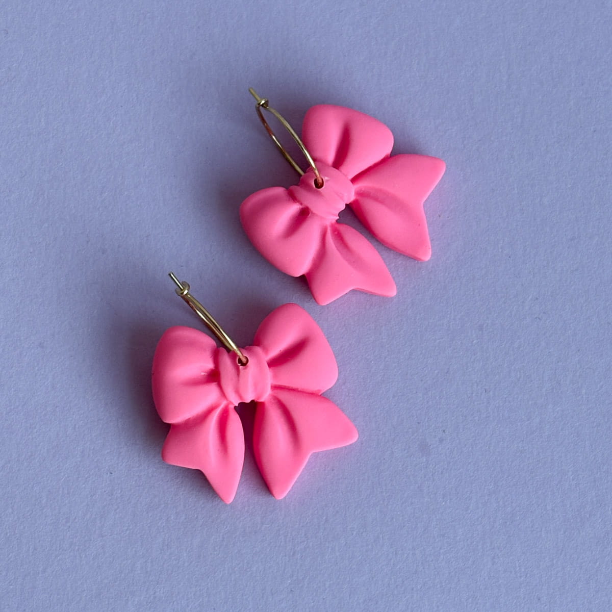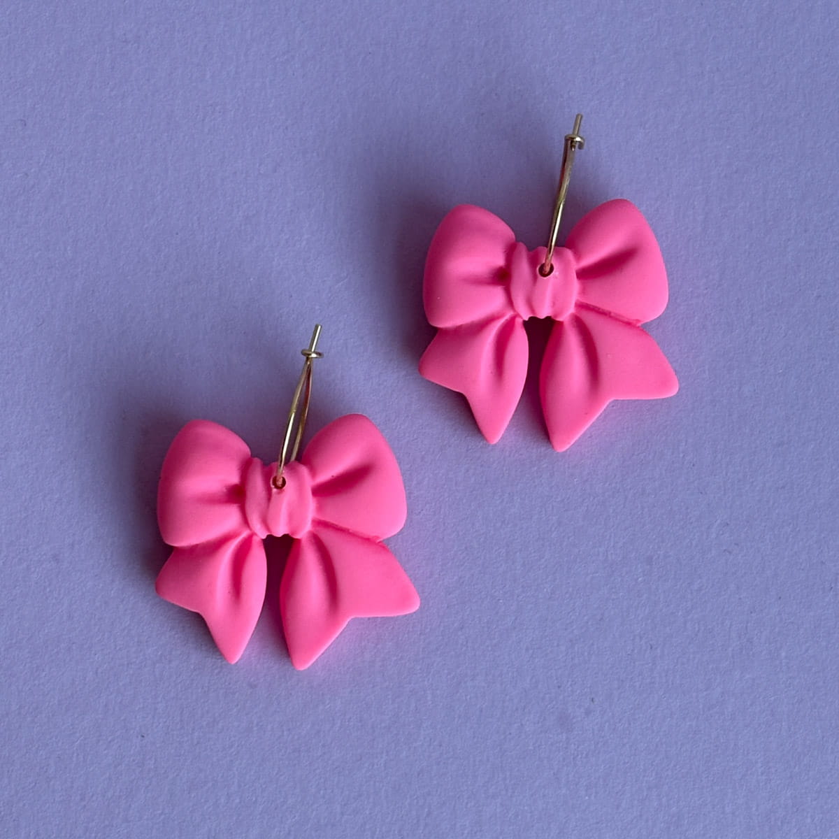 Diese Creolen sind laut gedacht – und genauso getragen. Das intensive Neonpink leuchtet schon von Weitem und macht die Schleife zum unübersehbaren Mittelpunkt. Auffällig, farbstark und selbstbewusst. Die schlichte Creole hält sich zurück und gibt der Schleife genau die Bühne, die sie verdient.