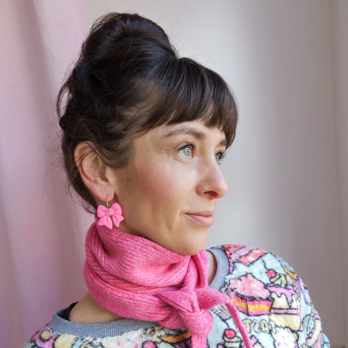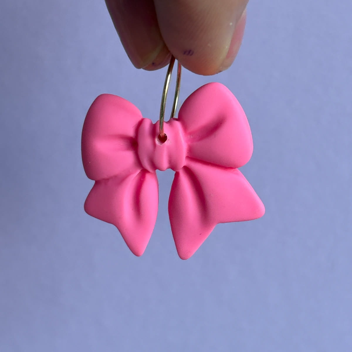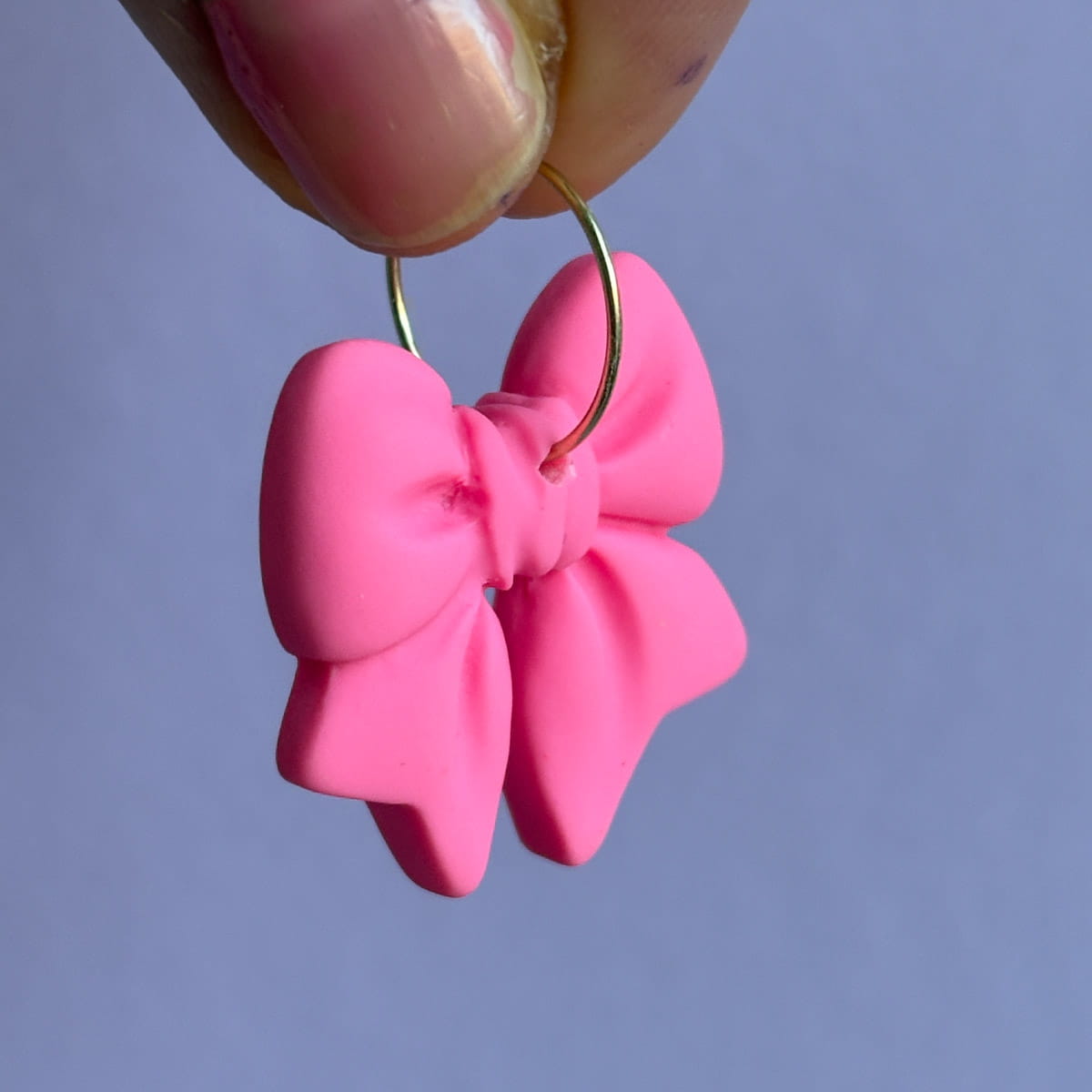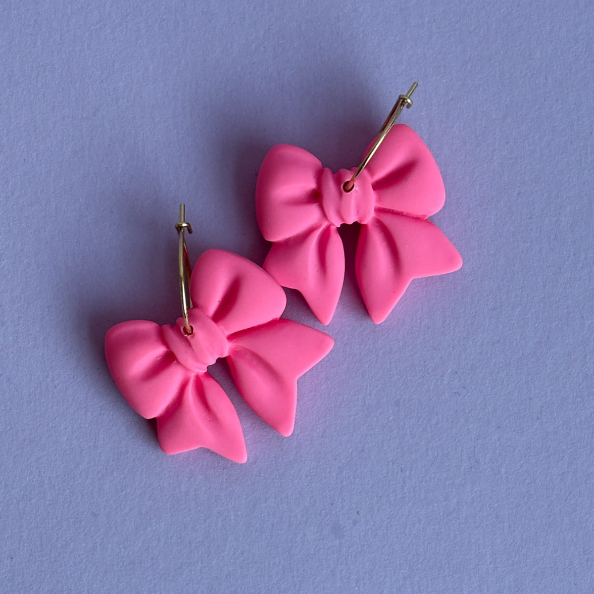 Diese Creolen sind laut gedacht – und genauso getragen. Das intensive Neonpink leuchtet schon von Weitem und macht die Schleife zum unübersehbaren Mittelpunkt. Auffällig, farbstark und selbstbewusst. Die schlichte Creole hält sich zurück und gibt der Schleife genau die Bühne, die sie verdient.