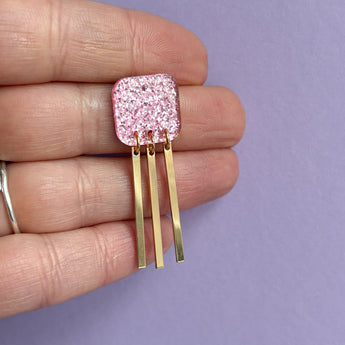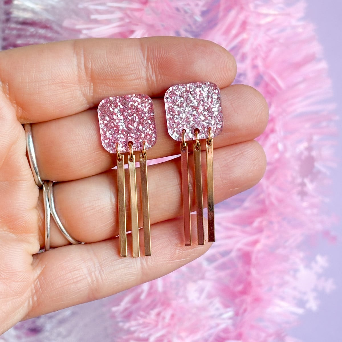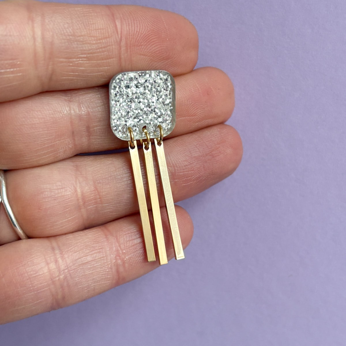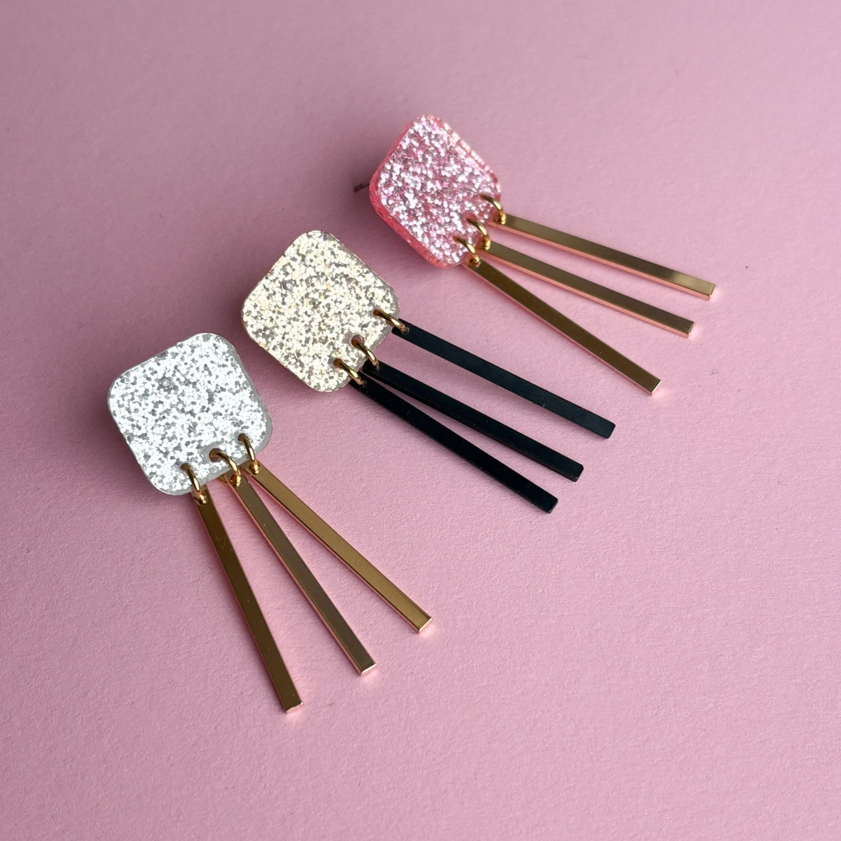 Drei Farben, ein klarer moderner Look: Silberglitzer, Goldglitzer und Pinkglitzer treffen hier auf eine geometrische Form und bewegliche Stäbchen. Ob cool in Silber, warm in Gold oder auffällig in Pink – jede Variante bringt einen klaren, modernen Akzent ins Outfit.