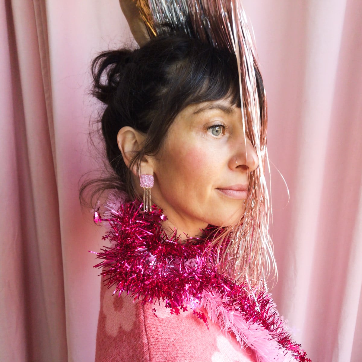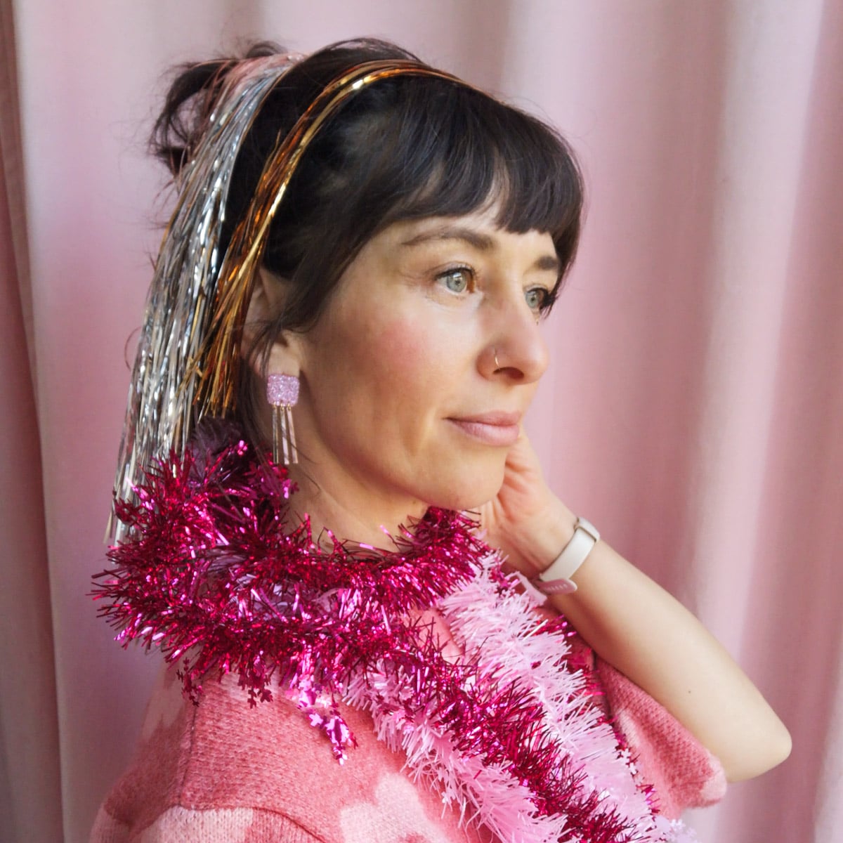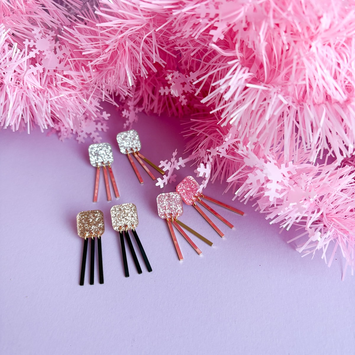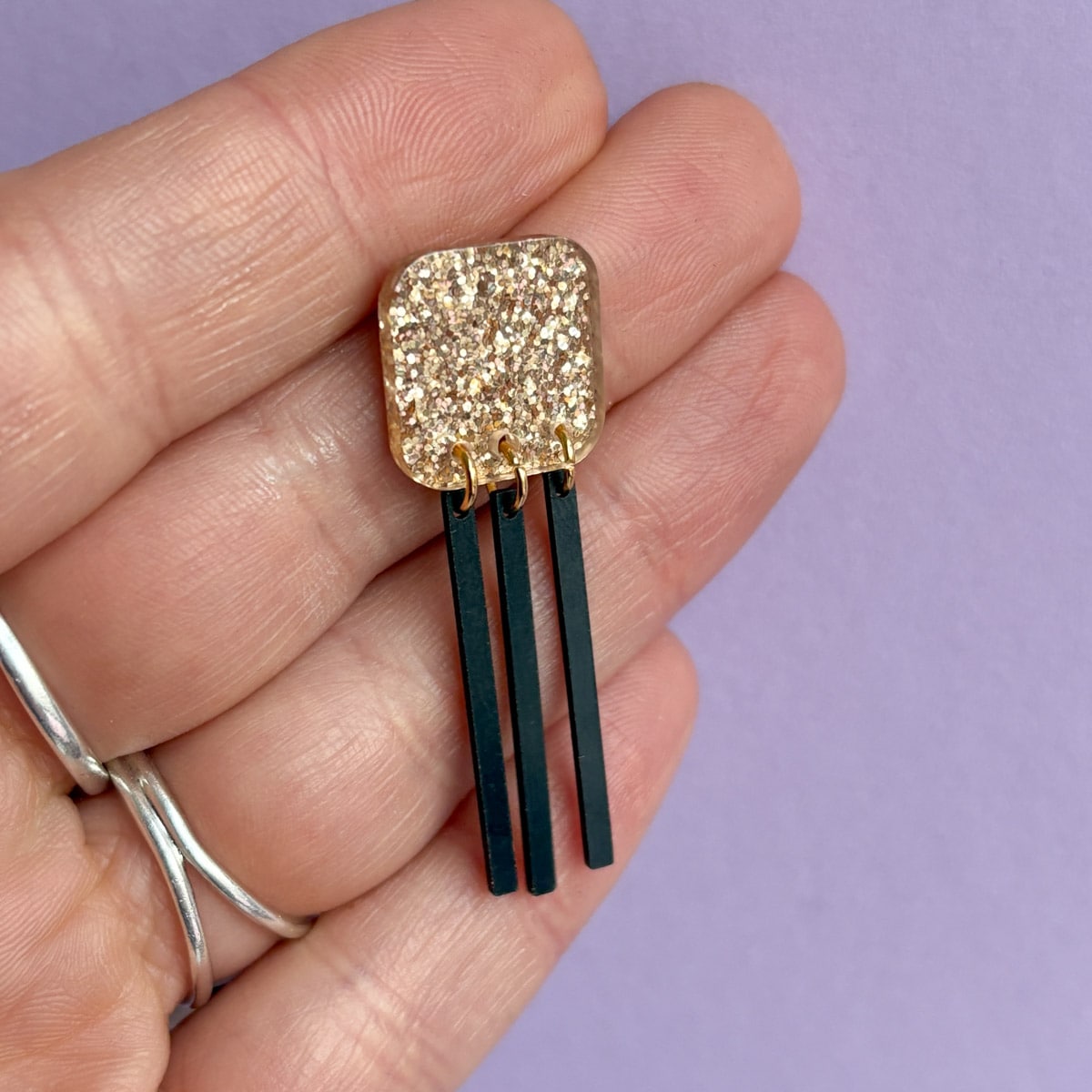 Drei Farben, ein klarer moderner Look: Silberglitzer, Goldglitzer und Pinkglitzer treffen hier auf eine geometrische Form und bewegliche Stäbchen. Ob cool in Silber, warm in Gold oder auffällig in Pink – jede Variante bringt einen klaren, modernen Akzent ins Outfit.