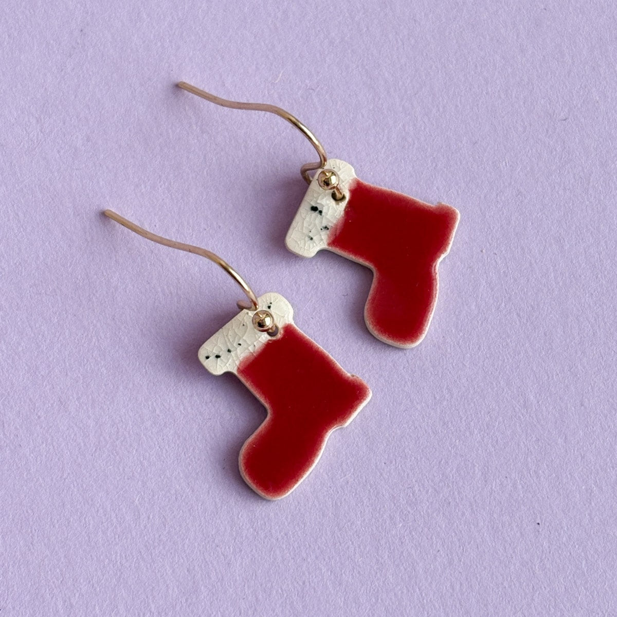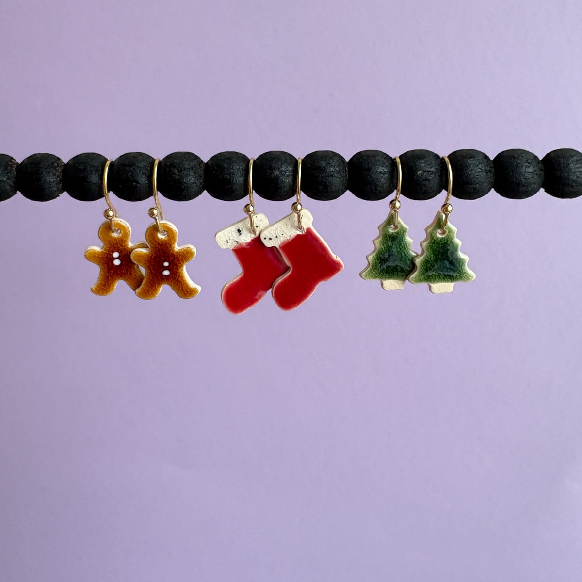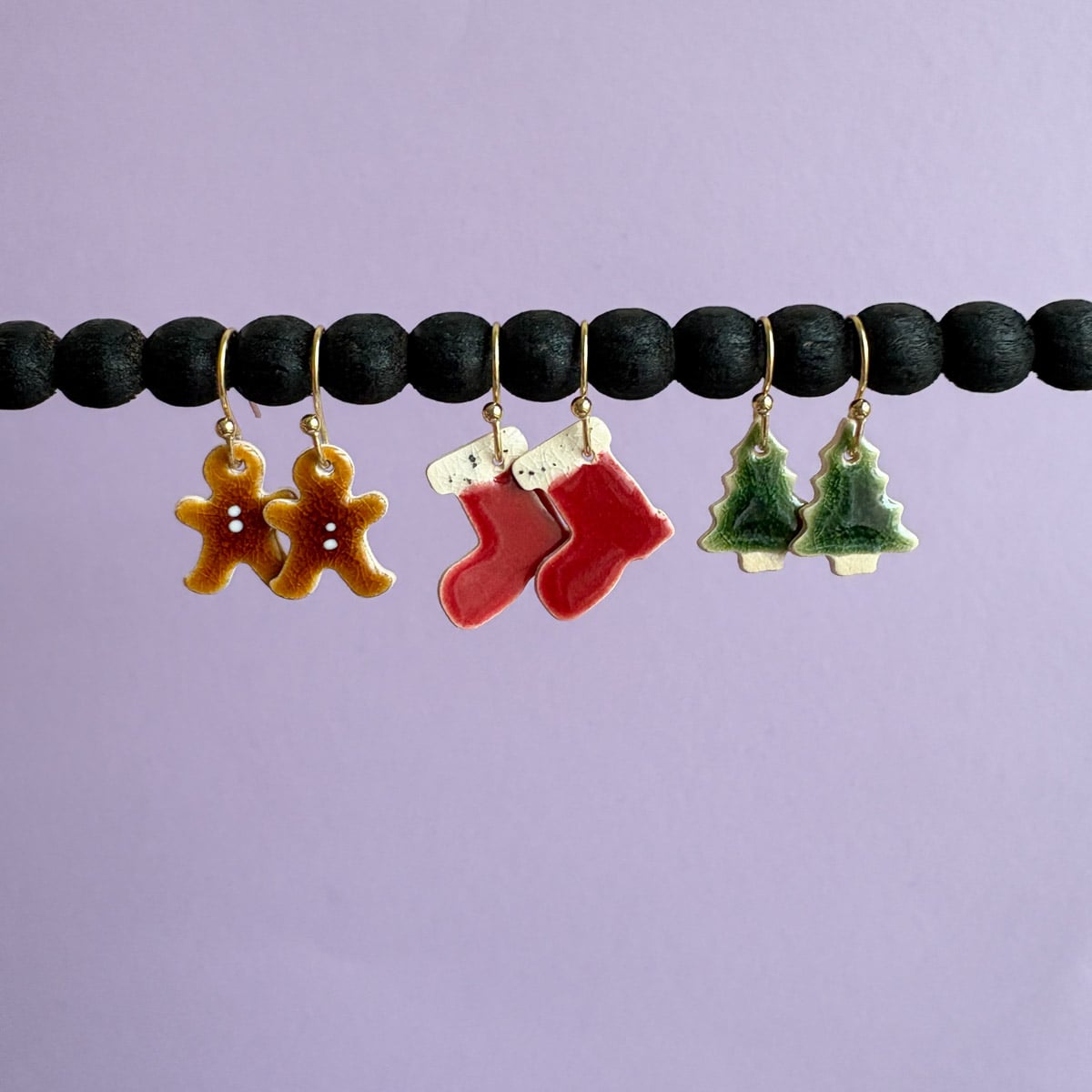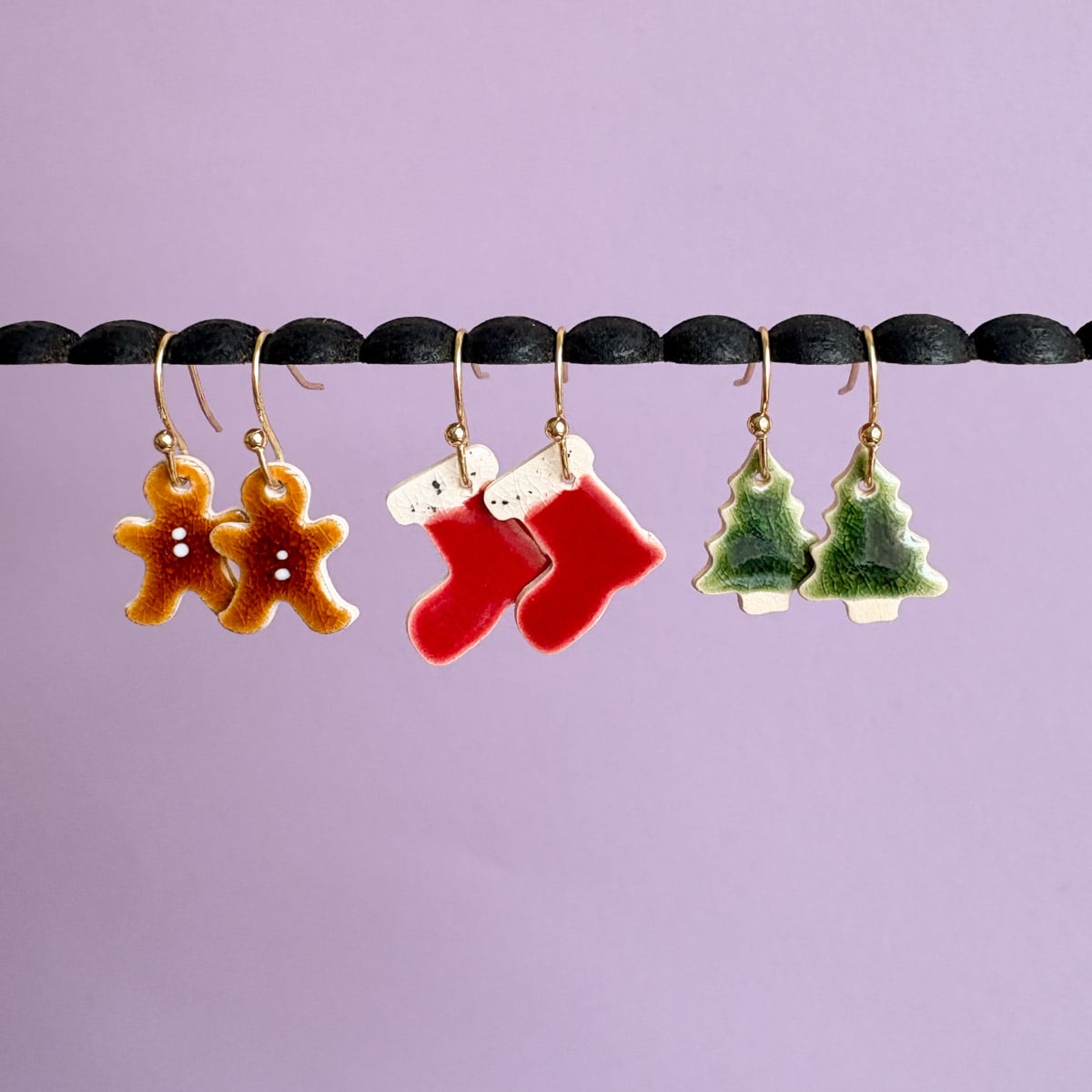 Keramik Weihnachtsohrringe – Lebkuchenmann, Stiefel & Tannenbaum