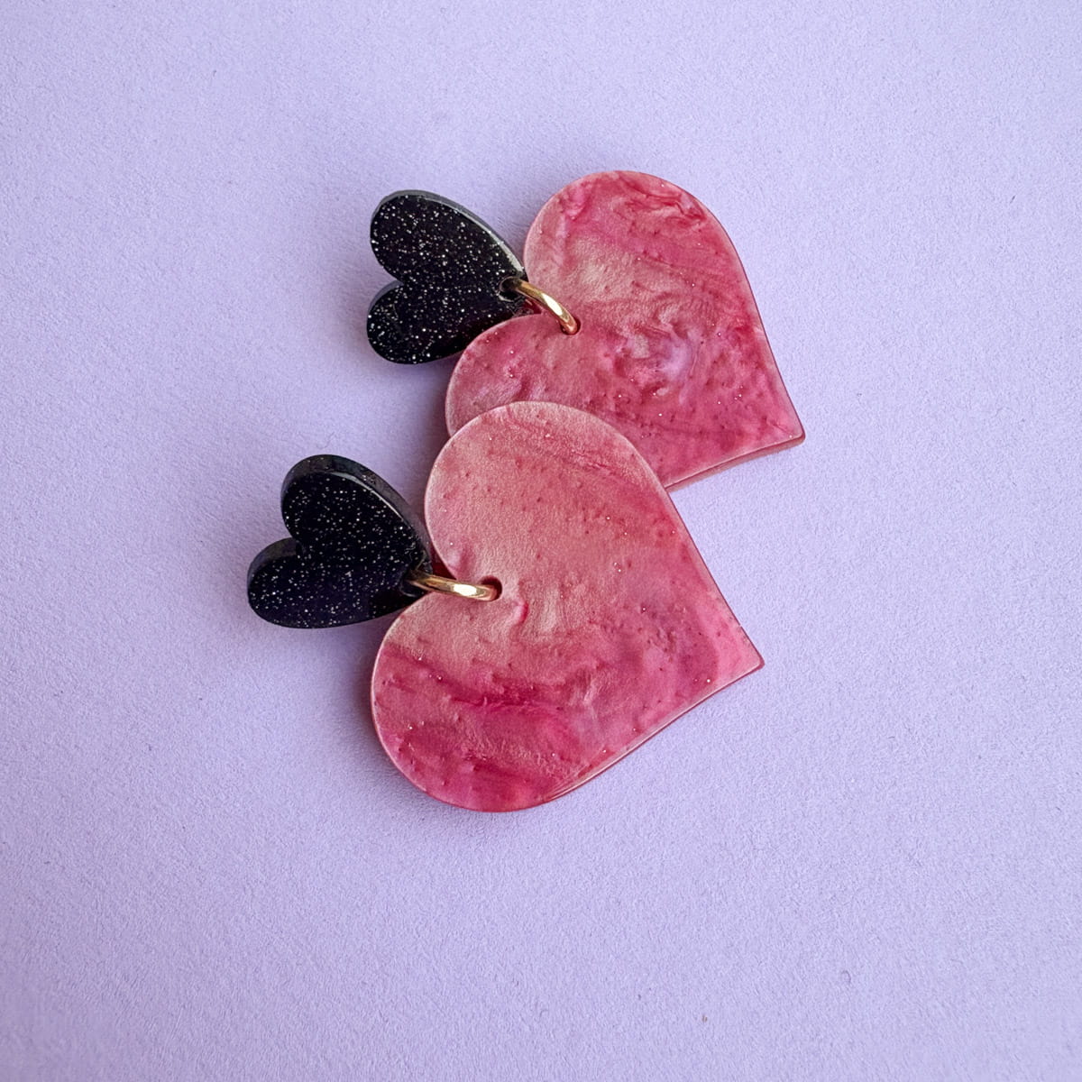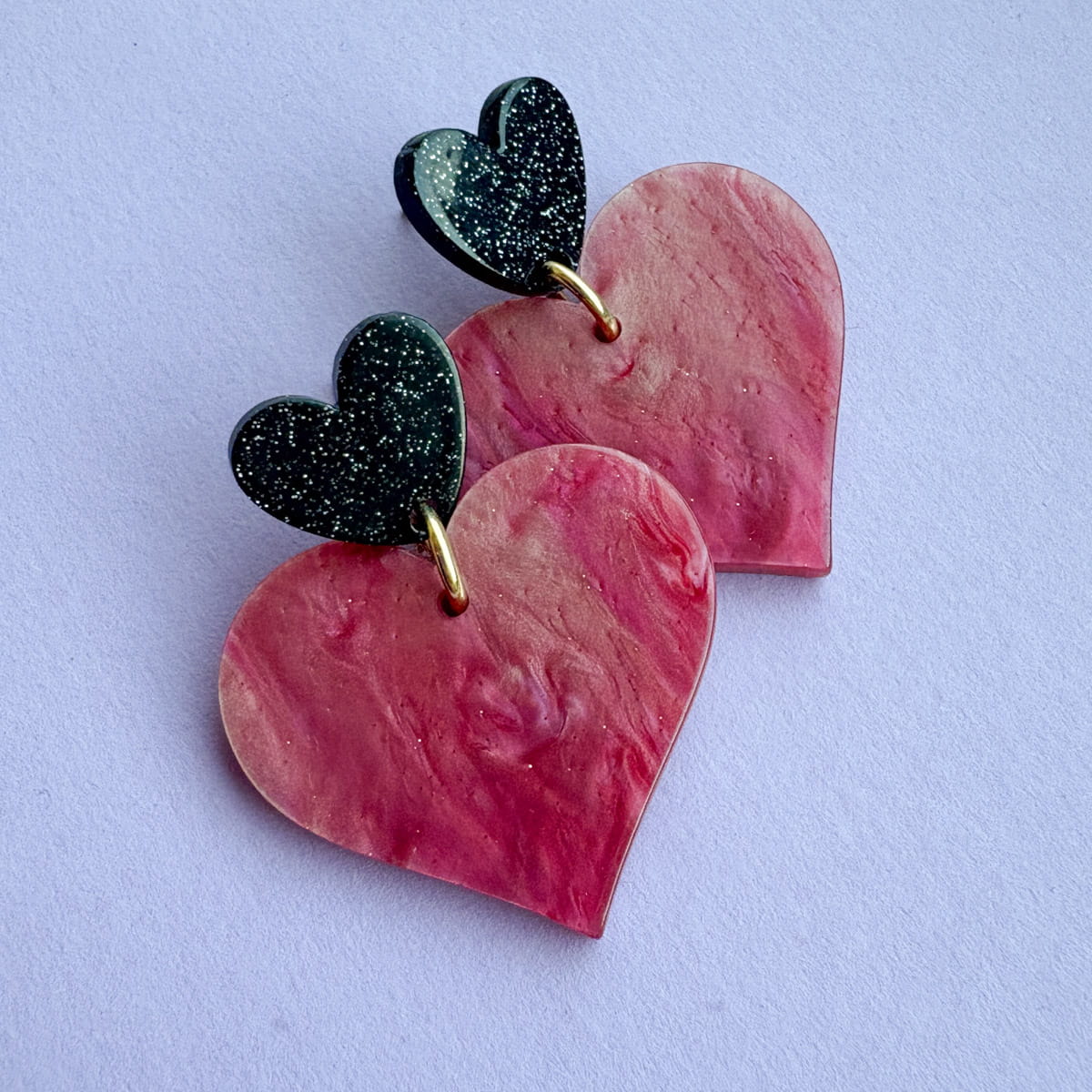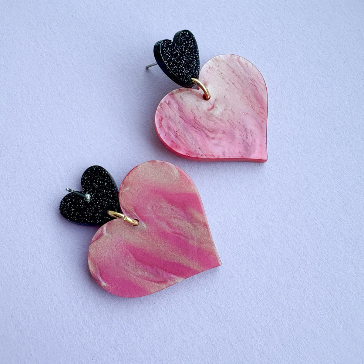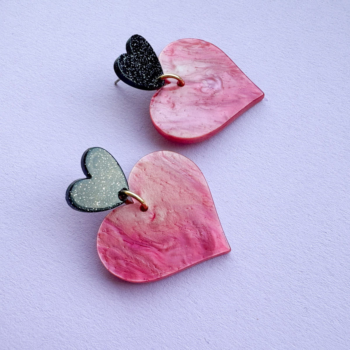 Statement Herz-Ohrringe in Nude-Rosa & Schwarz mit Glitzer