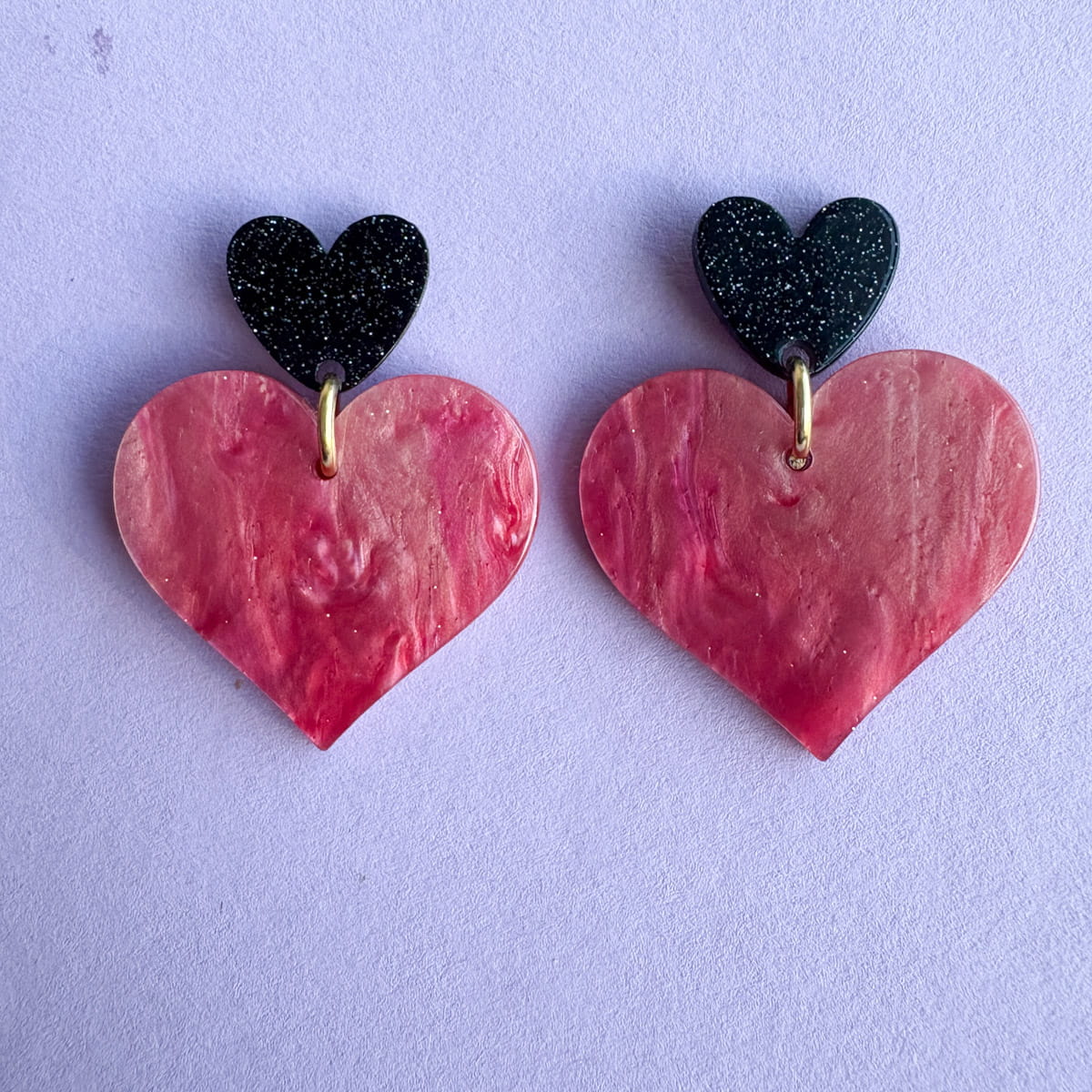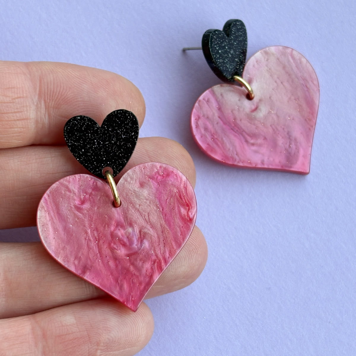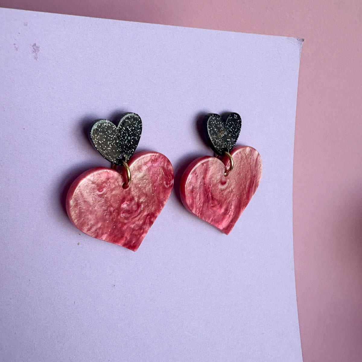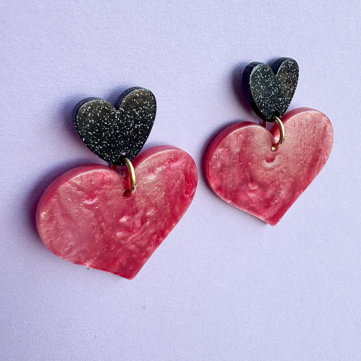 Statement Herz-Ohrringe in Nude-Rosa & Schwarz mit Glitzer