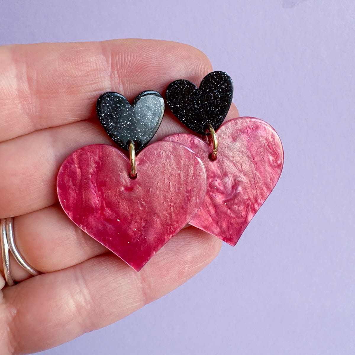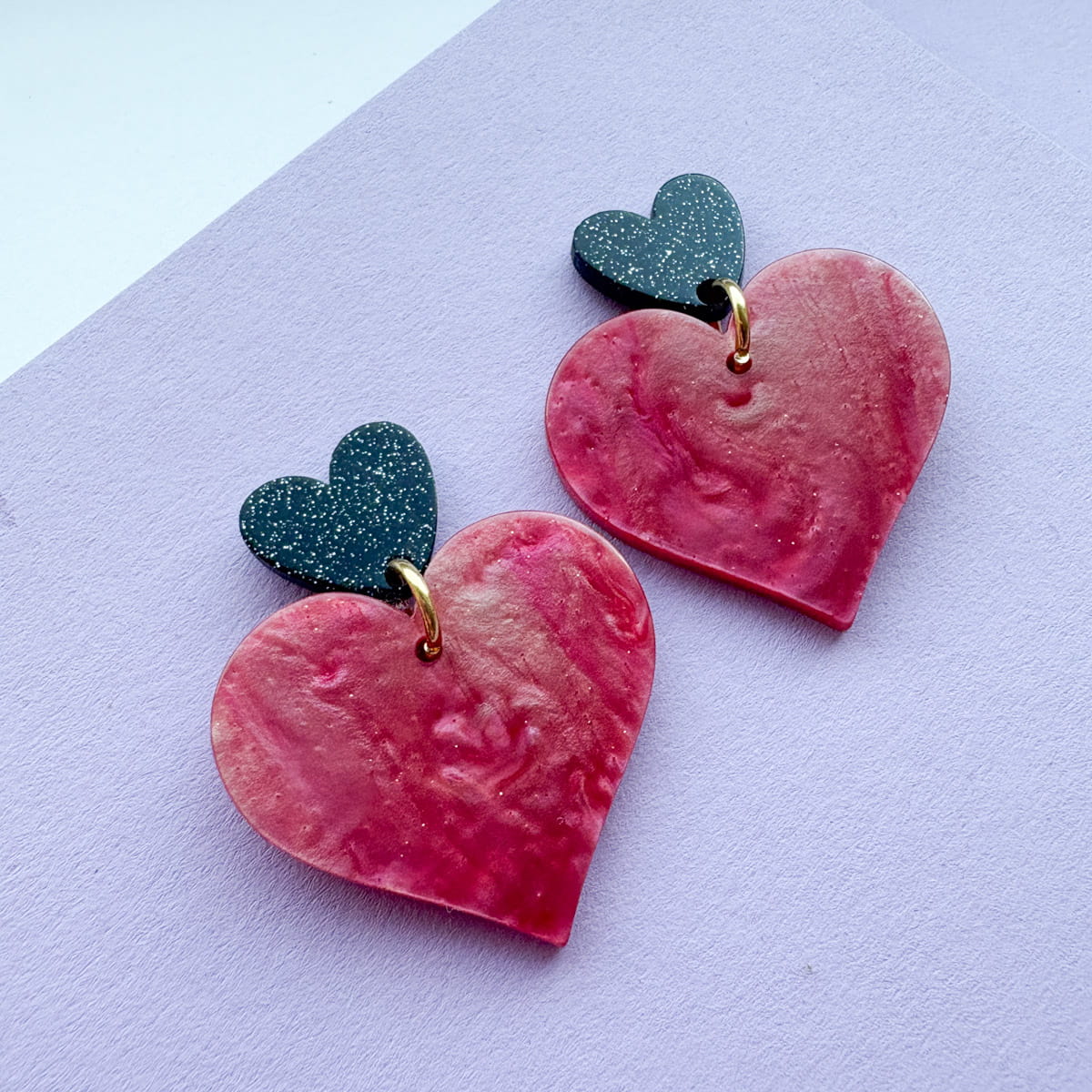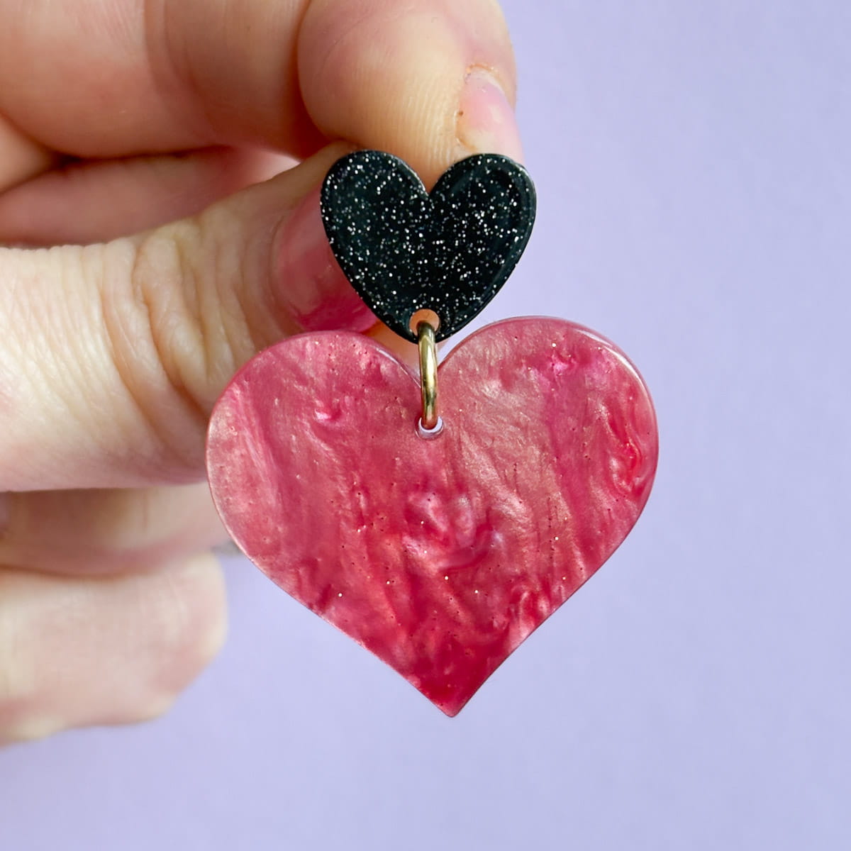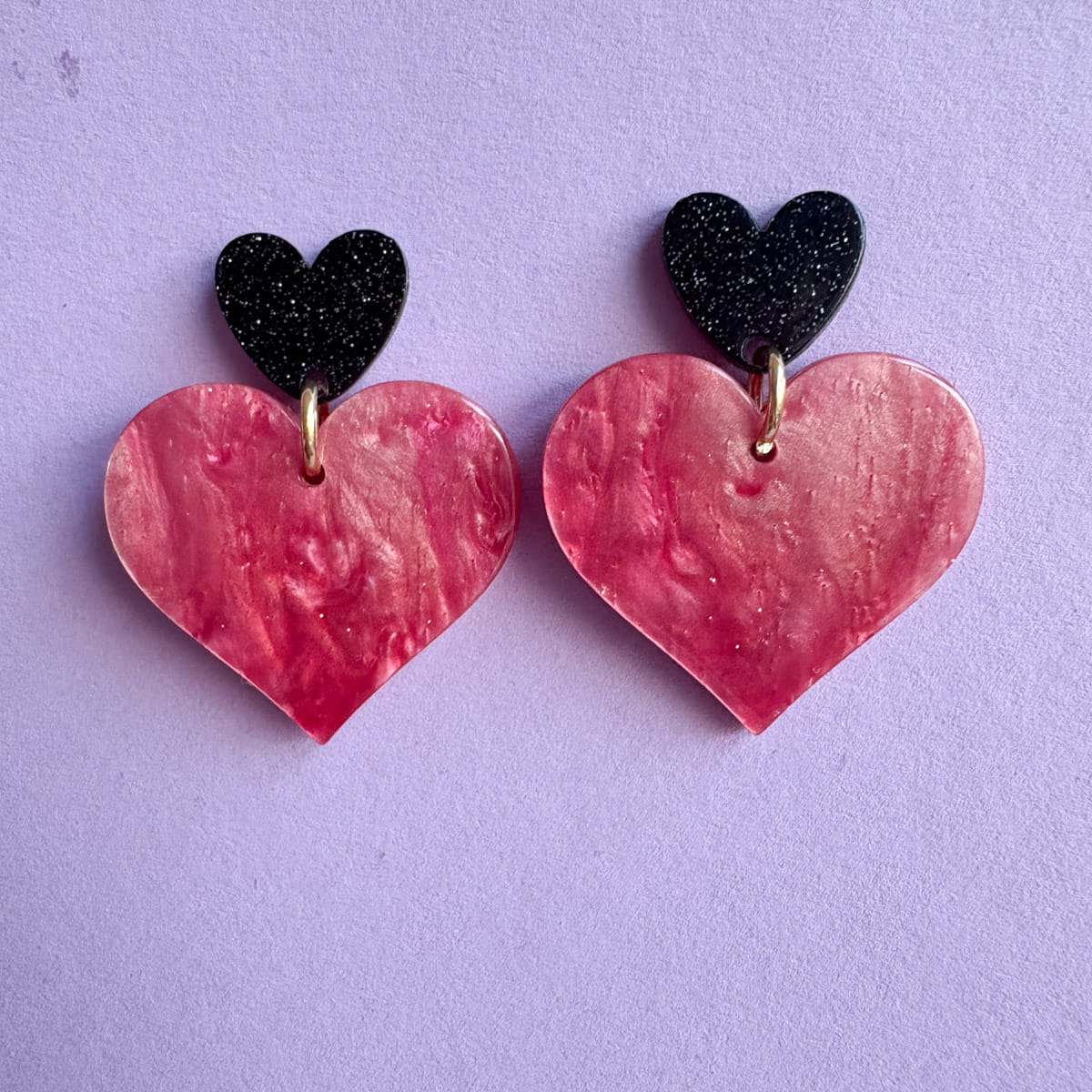 Statement Herz-Ohrringe in Nude-Rosa & Schwarz mit Glitzer