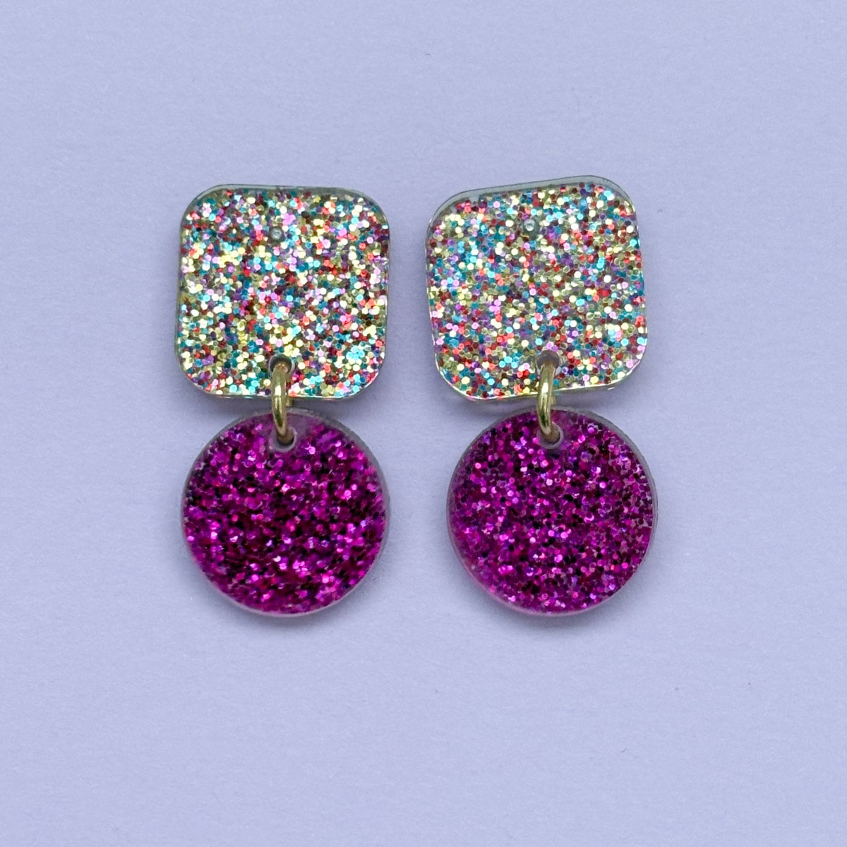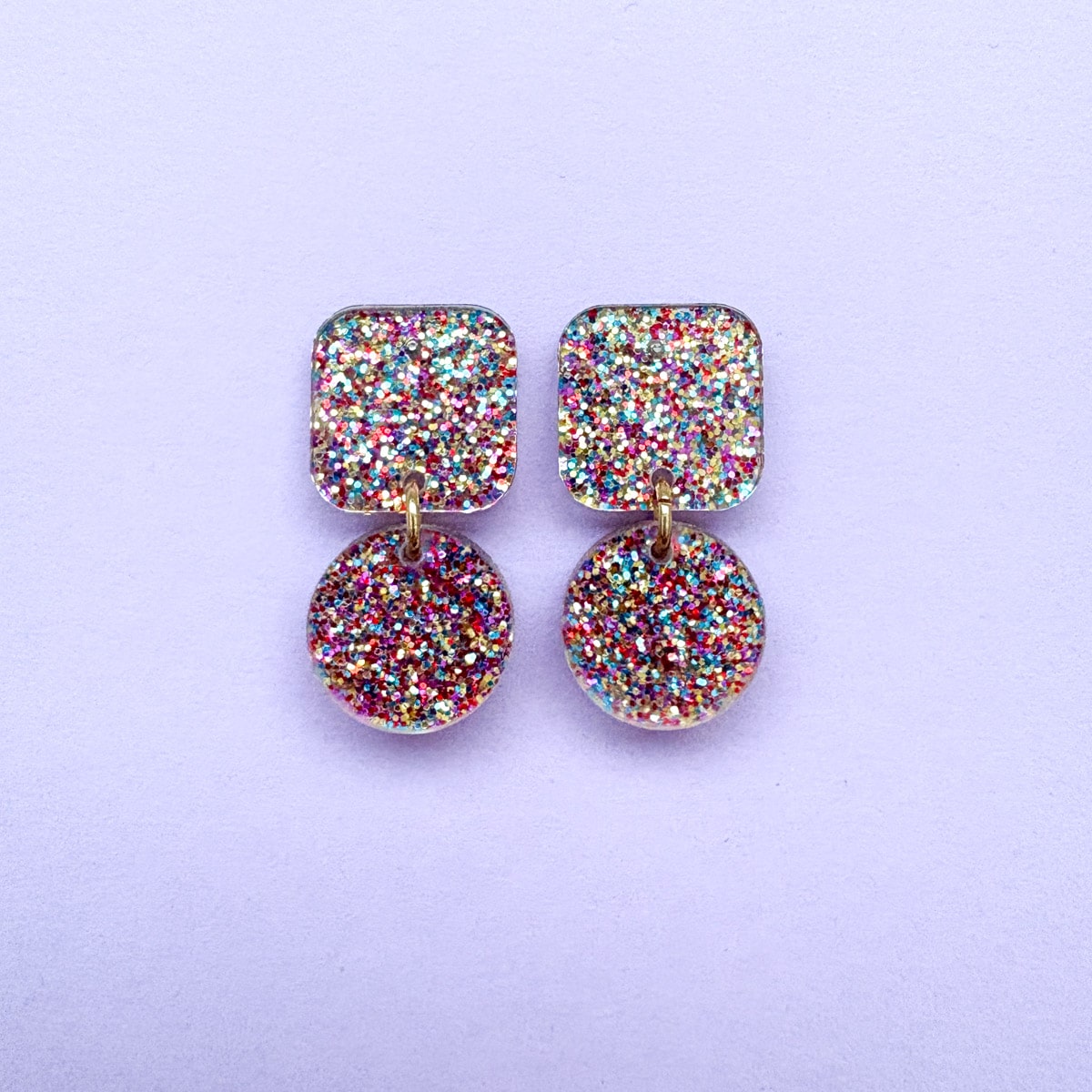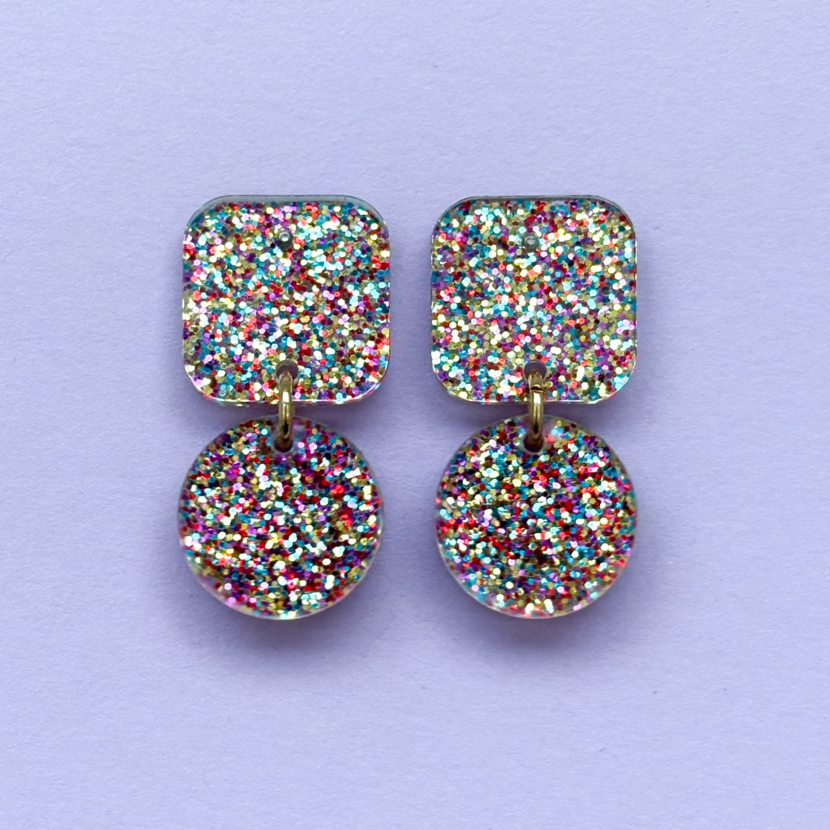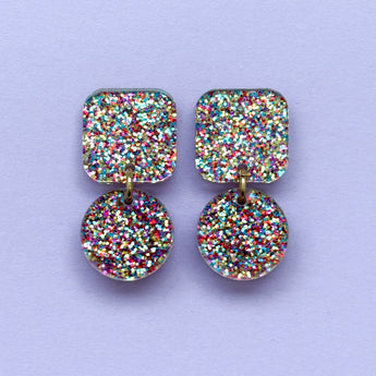 Diese Statement-Ohrringe machen gute Laune, noch bevor du das Haus verlässt. Die Kombination aus funkelndem Konfetti-Glitzer und klaren geometrischen Formen sorgt für einen Look, der auffällt, aber tragbar bleibt. Perfekt für den Alltag, fürs Büro mit Augenzwinkern oder als Farbkontrast zu schlichten Outfits.