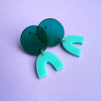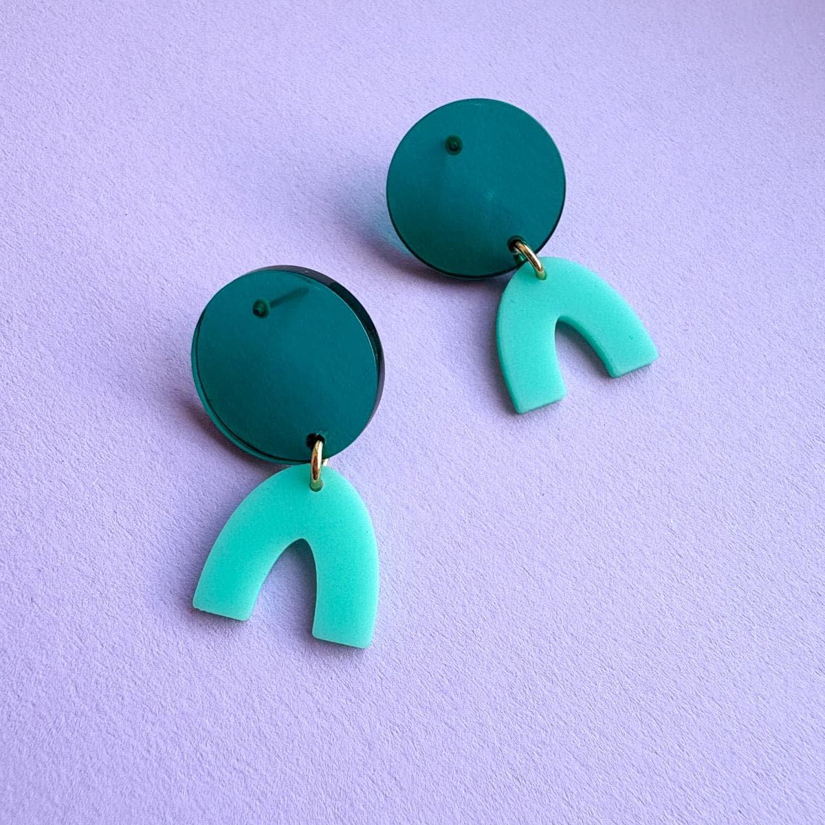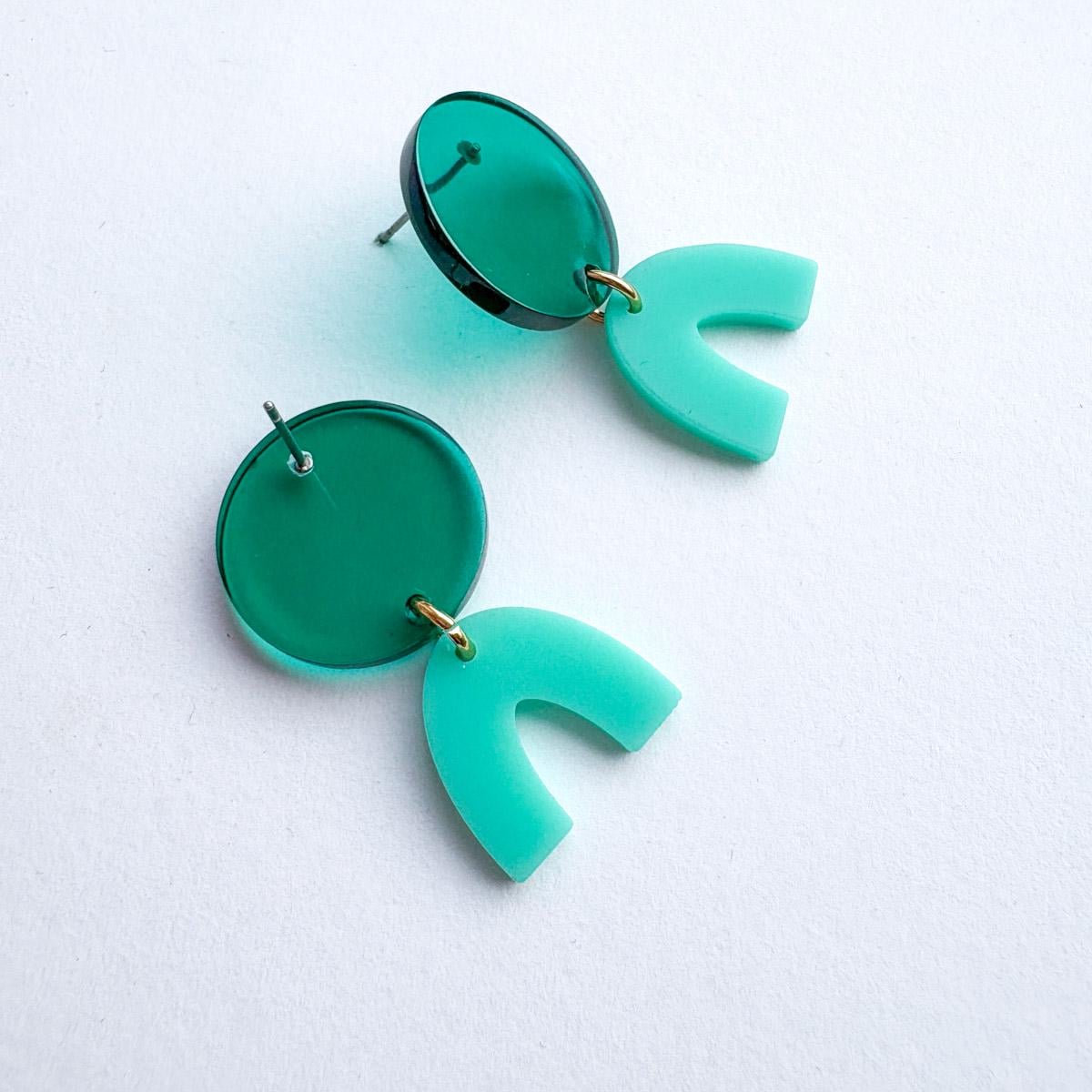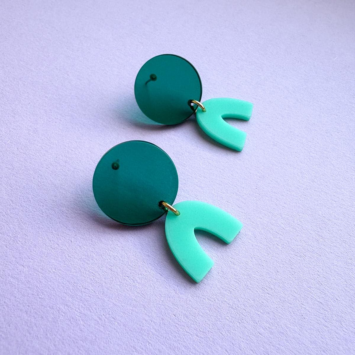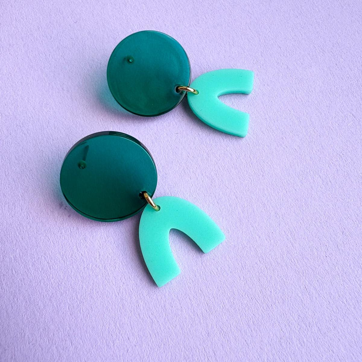 Diese grünen Statement-Ohrringe spielen mit Kontrasten: Ein transparenter, tiefgrüner Stecker trifft auf einen matten, mintgrünen Anhänger – modern, frisch und unverwechselbar.