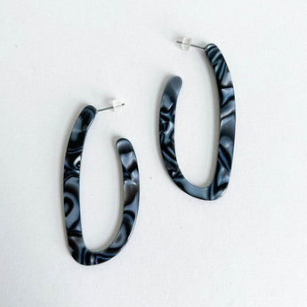 Federleichte ovale Creolen in grau-schwarz mit Perlmuttschimmer.