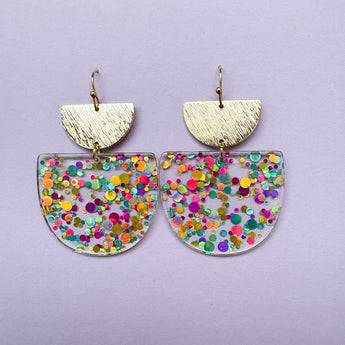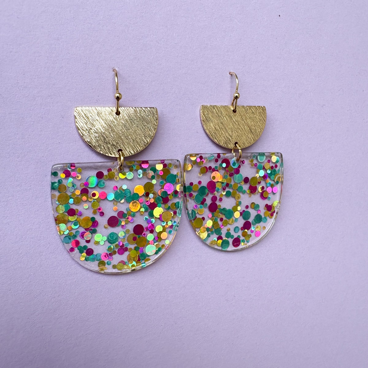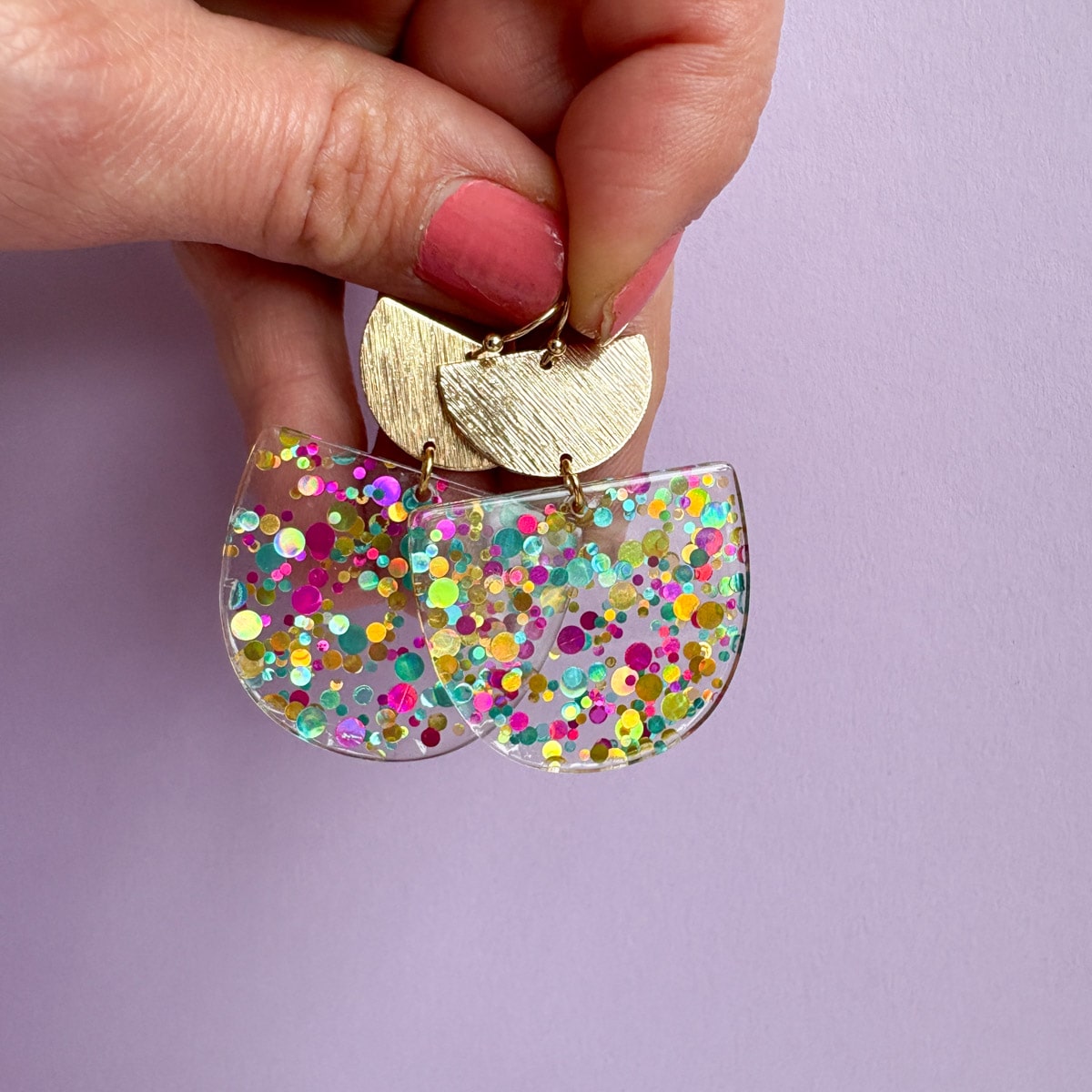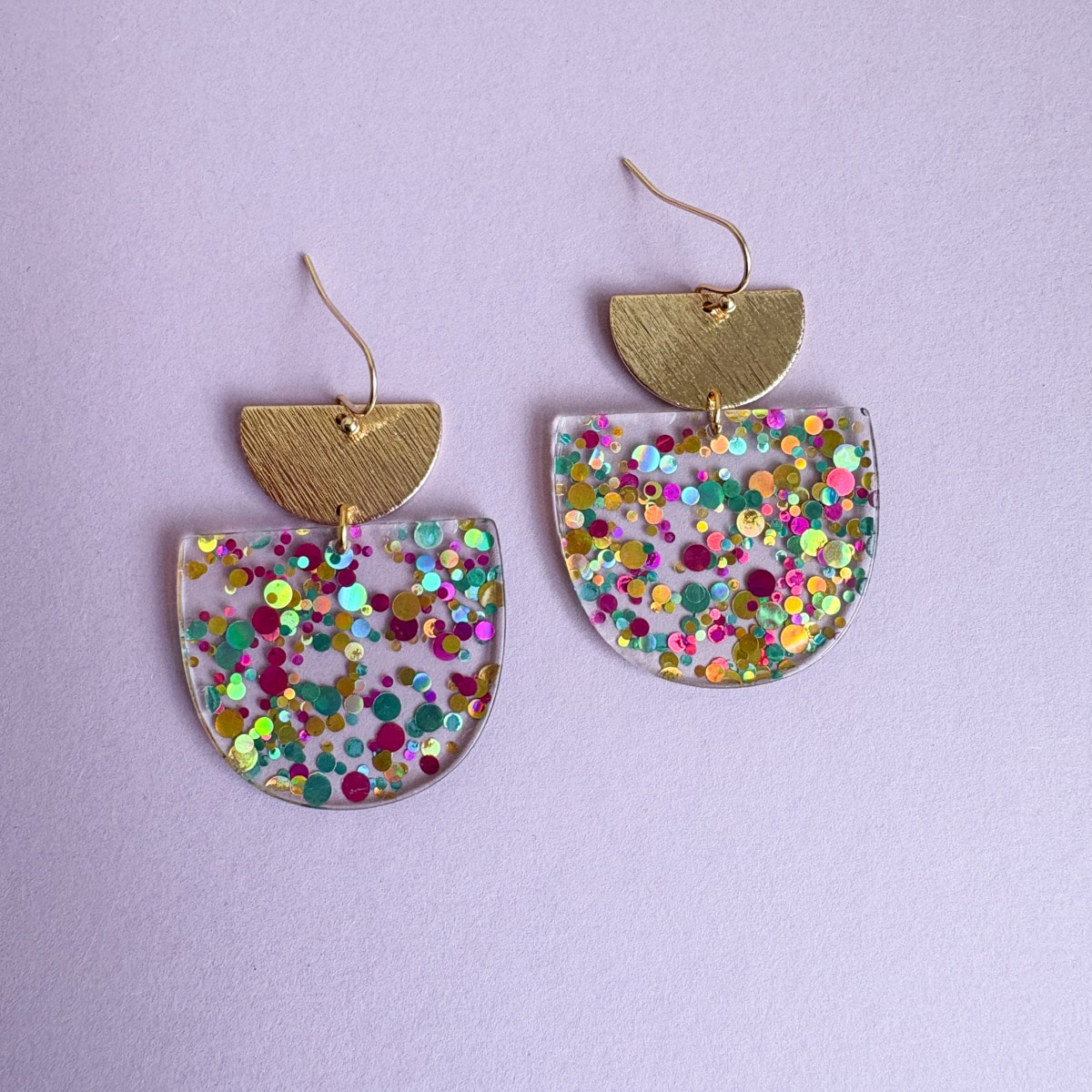- Glitzer-Highlight: Das bunte Glitzer im Acrylhalbkreis sorgt für einen lebendigen Akzent und macht diese Ohrringe zu einem echten Blickfang.